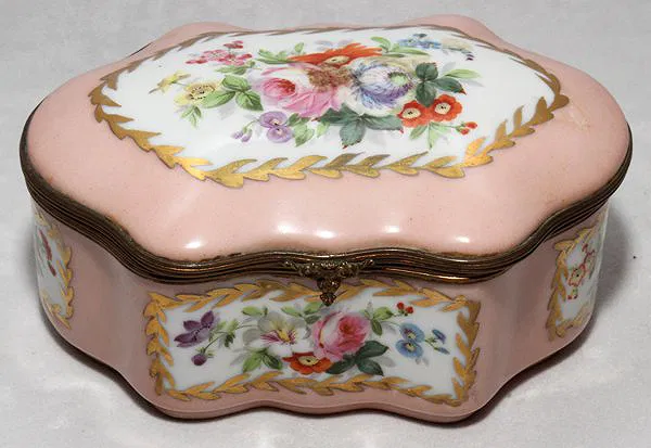 FRENCH DRESSER BOX, EARLY 20TH CENTURY, H 3 1/2″, L 7″:Pink porcelain box with floral motifs; hinged cover. “Exclusively for Paris Decorators Made in France” stamped in red, over glaze, at the underside.