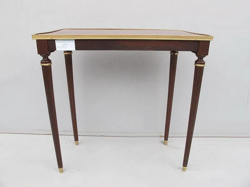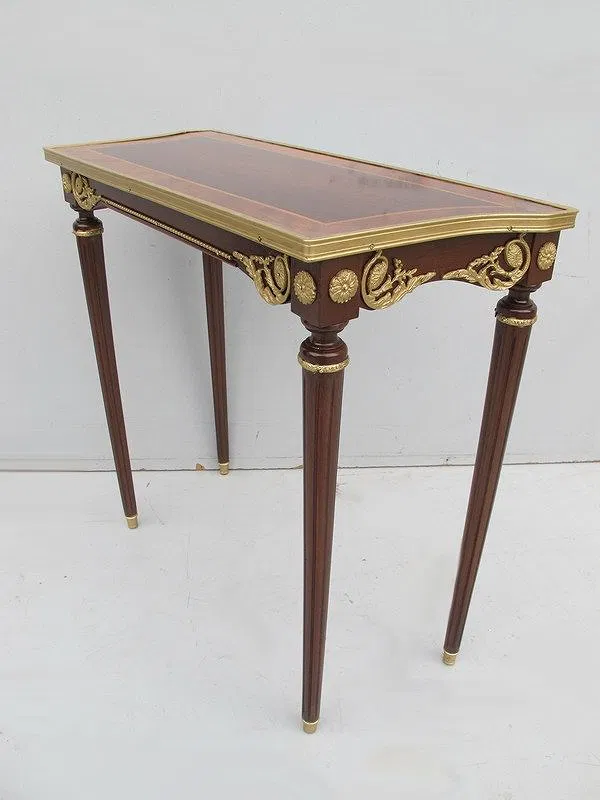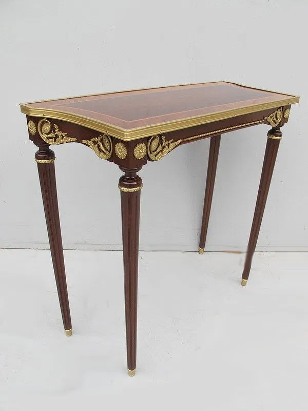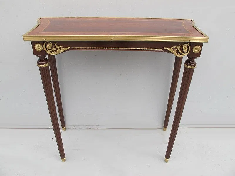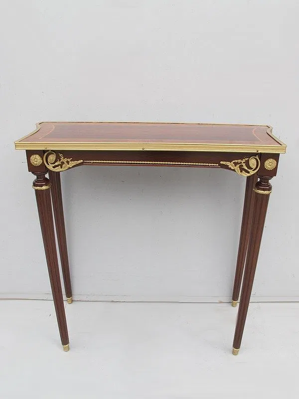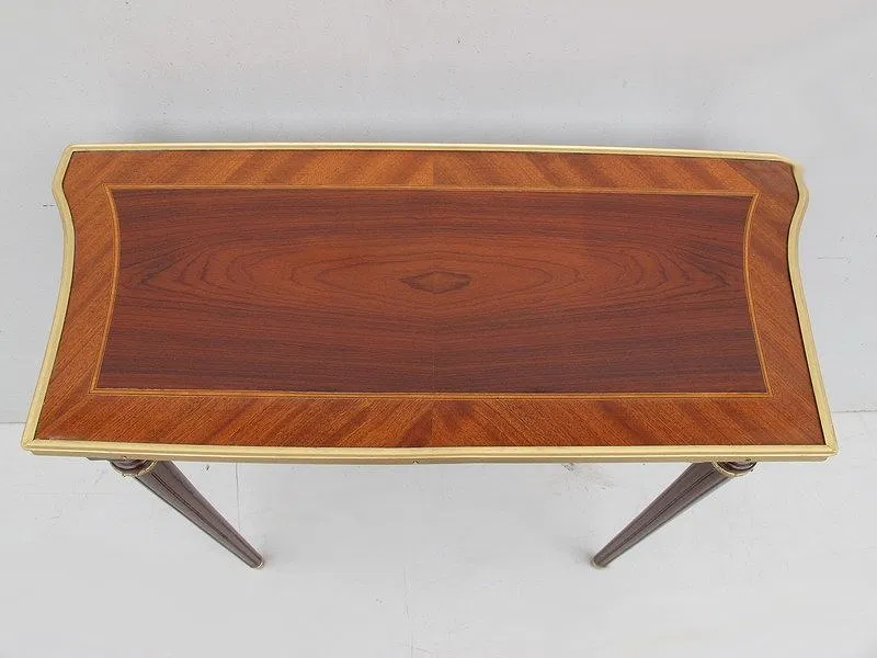 French Louis XVI console table, made in solid and veneer mahogany and walnut in the French Louis XVI style with bronze and inlaid details. 28” H x 30” W x 13” D.