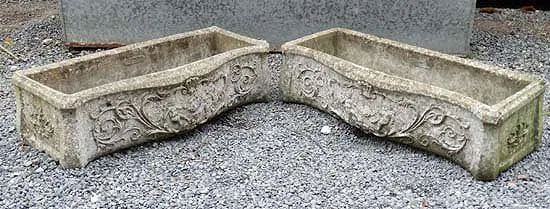 Item Details Description Garden & Architectural : a mid- late 20 thC pair of re-constituted stone serpentine fronted garden toughs, each 29 1/4” long x 8” high