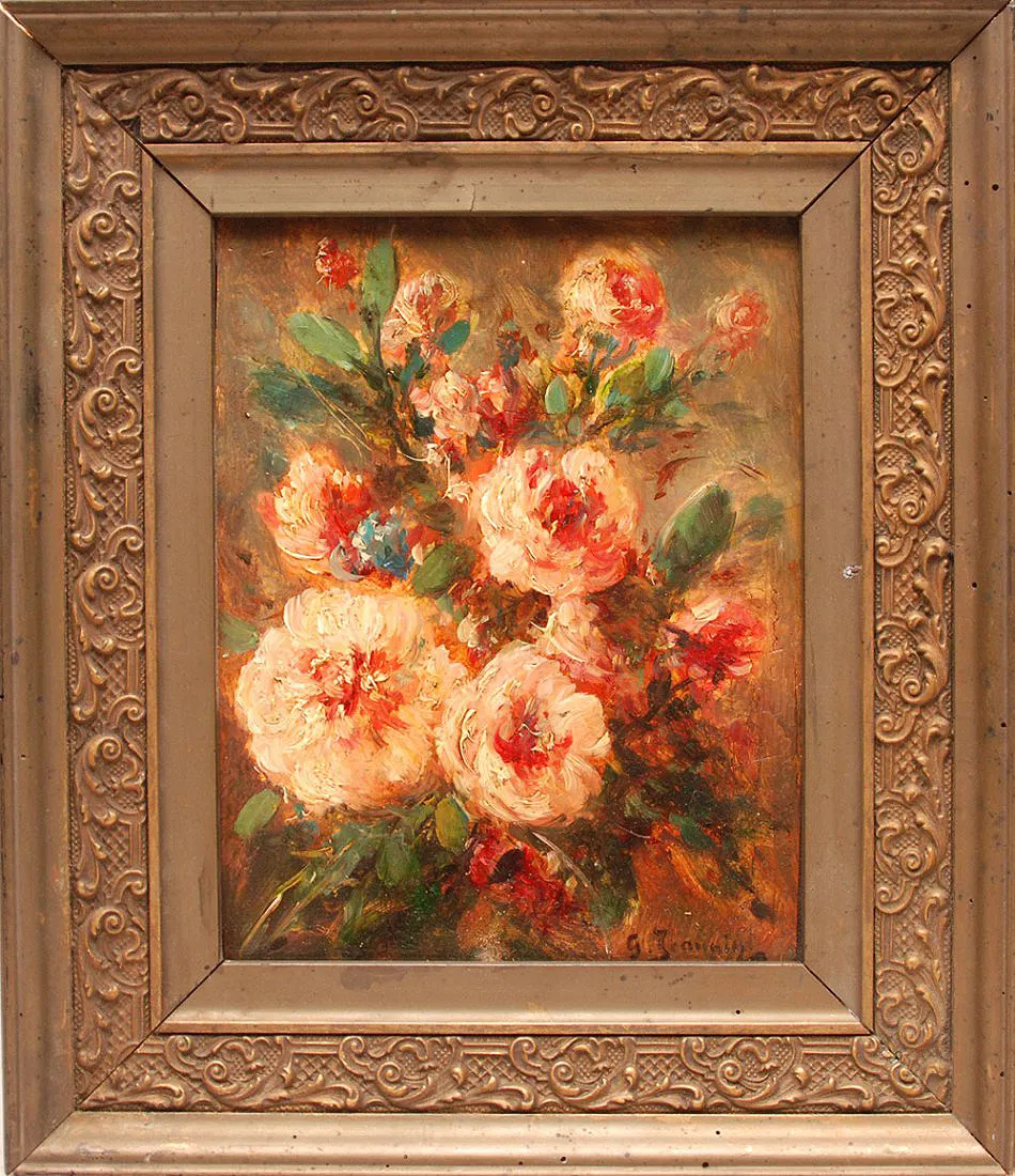 Georges Jeannin (France 1841 – 1925) oil on panel, still life flowers, 9-1/4″ x 7-1/4″