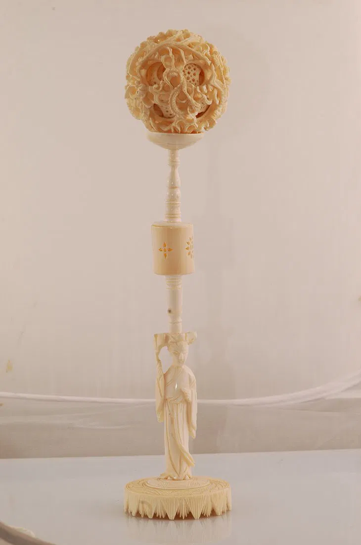 Hand carved Mammoth Ivory 14 layer puzzle ball with stand. Lady is holding the ball on her head. Intricate carved dragons make up the outer layer. Ball 2.5″ in diameter, stand is 8″ tall.