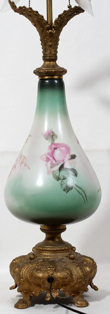 HAND PAINTED VASE MOUNTED AS LAMP, H 38 “:Including one hand painted vase mounted as a lamp. Piece features a red rose motif. Overall height: 38 “. Circa 1900