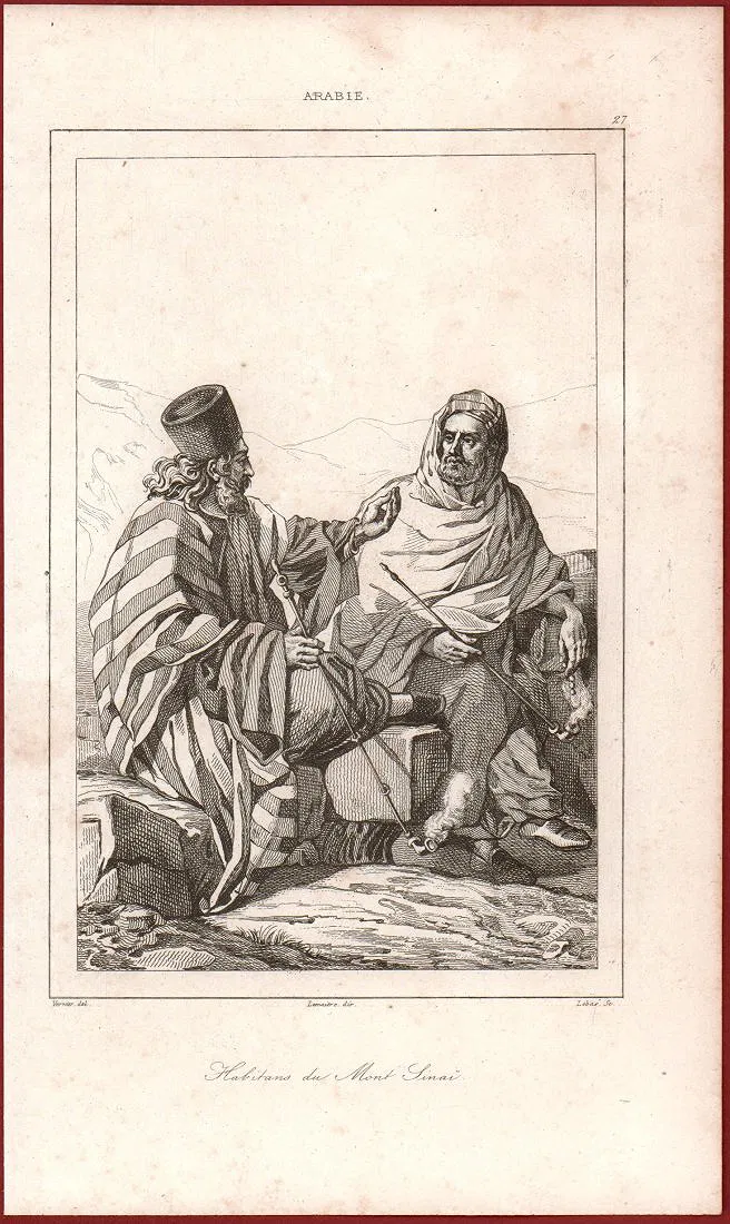 Item Details Description Print of steel engraving titled „Habitans du Mont Sinai.“. Drawn by Vernier. Engraved by Lebar. From „Arabie, par M. Noel Desvergers, vice-president de la societe de geographie, Avec une carte de L‘arabie et note sur cette carte, par M. Jomard, membre de l‘institut. Paris, Firmin didot freres, editeurs, imprimeurs de l‘institut de France, 1847. Mount Sinai, also known as Mount Horeb, is a mountain in the Sinai Peninsula of Egypt that is a possible location of the biblical Mount Sinai. The latter is mentioned many times in the Book of Exodus and other books of the Bible, and the Quran. According to Jewish, Christian, and Islamic tradition, the biblical Mount Sinai was the place where Moses received the Ten Commandments. Approx. image size 12,3 x 20,4/8,9 x 13,8 cm.Condition: good.