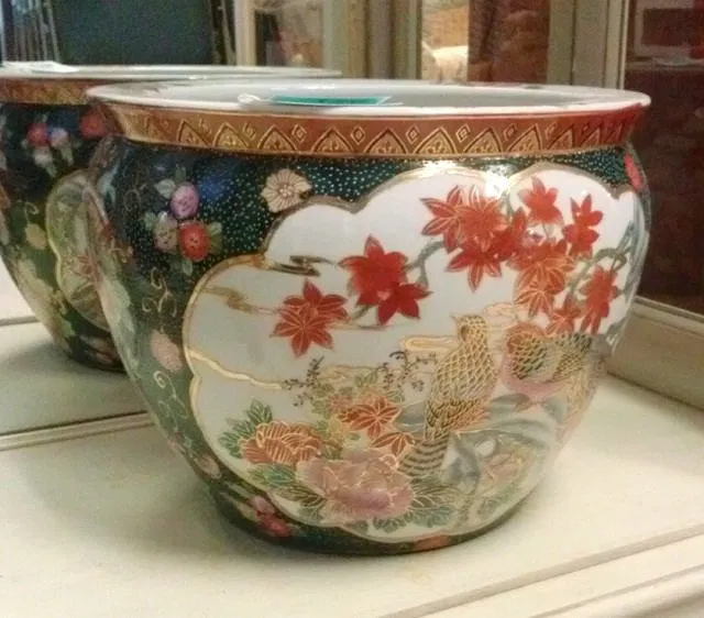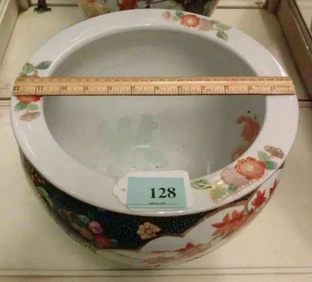 Large Asian ceramic pot featuring a birds motif, approximately 1 ft (30 cm) in diameter.