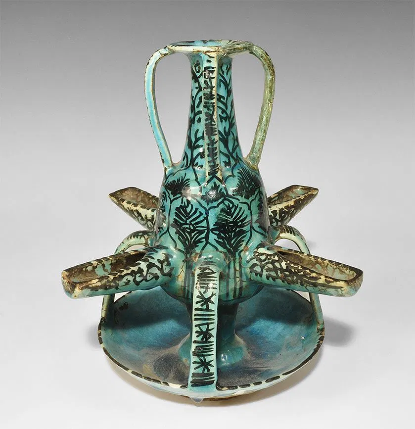 18th century AD. A blue-glazed lamp comprising a broad bowl with central vertical column, bulb with four flat-section straps to the rim of the bowl and four deep nozzles; conical neck with flared rim and four round-section straps; the surface with black segmented and foliate ornament. From an old London collection, formed in the 1980s. 1.2 kg, 25.5 cm (10″).
