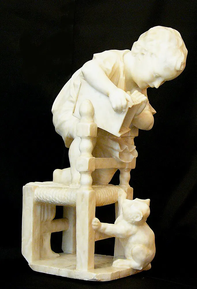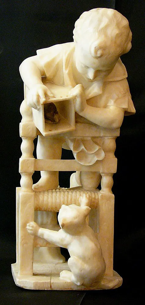 Italian alabaster sculpture, Boy kneeling on a stool showing a mouse in box to a young cat, Italian 19th Century. Cracks, chips, minor parts missing.