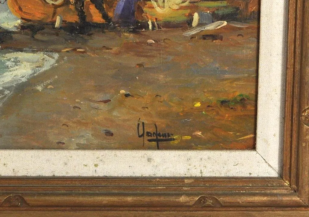 Framed oil on canvas, Italian coastal scene with fishermen securing their boats in foreground. 27 3/4″ high, 36″ wide; sight size: 19 1/2″ high, 27 1/4″ wide.