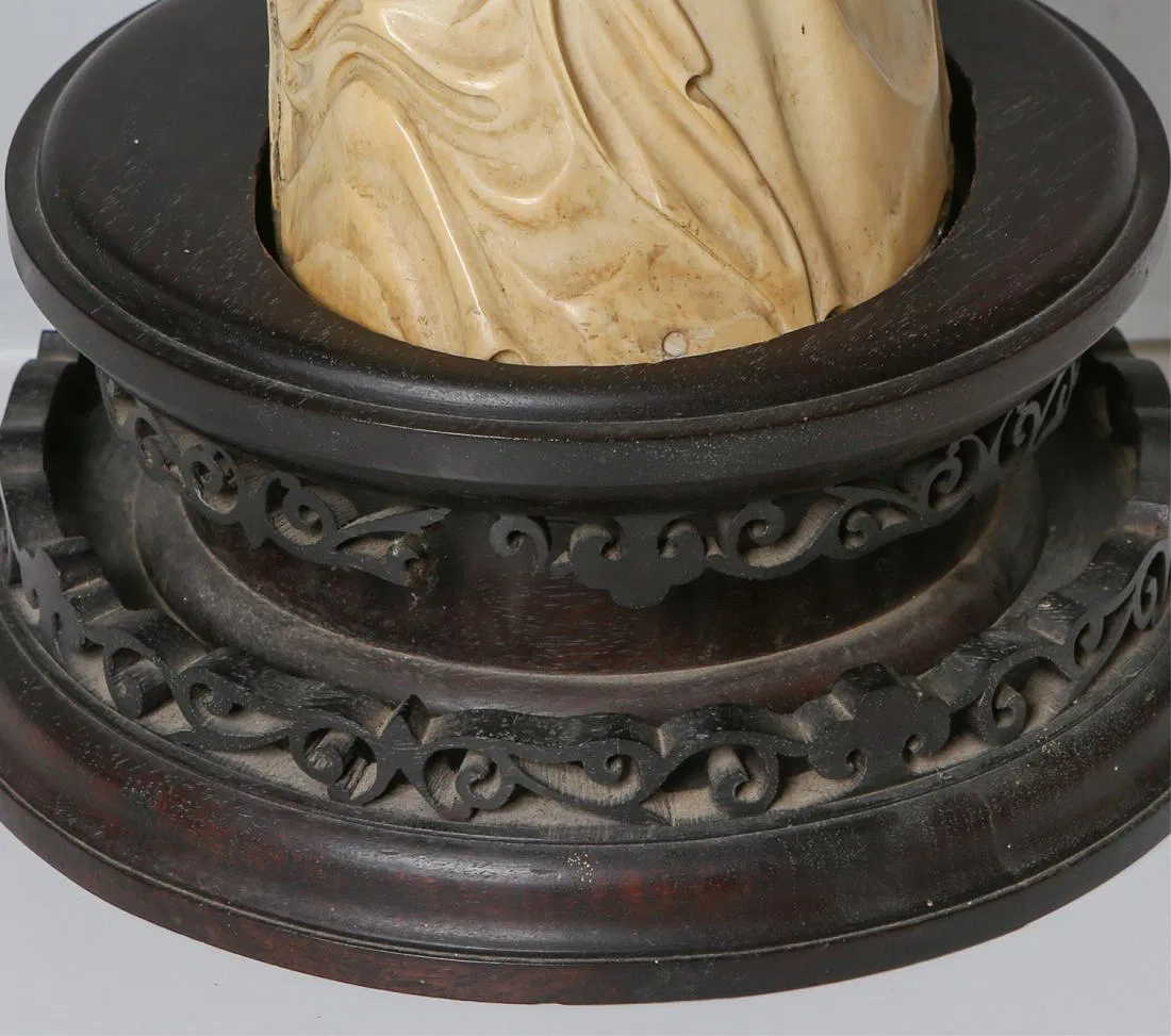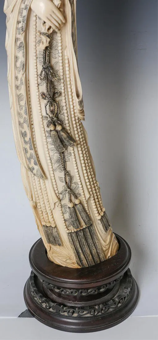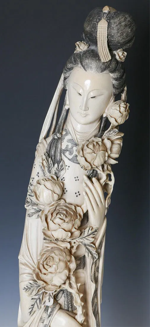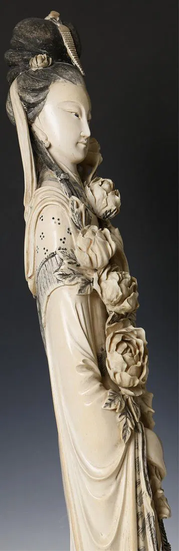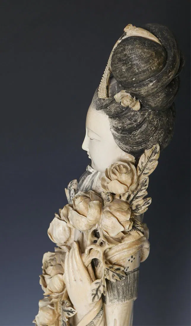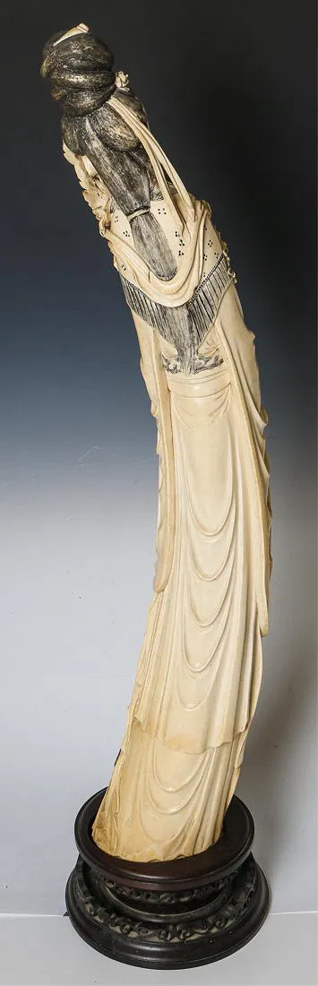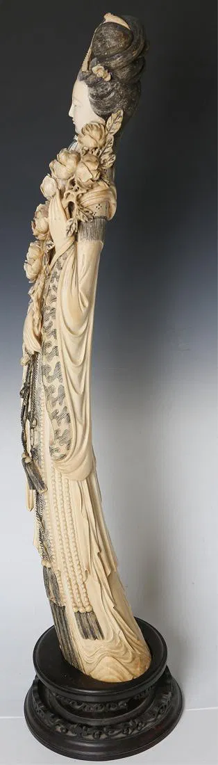 LARGE 19TH C. CHINESE CARVED IVORY BEAUTY A Large Chinese carved ivory Empress or Beauty, 19th C., holding flowers in hand, wearing long flowing gown, monochrome, with wooden stand. Weight: 10.5kg Size: 42″