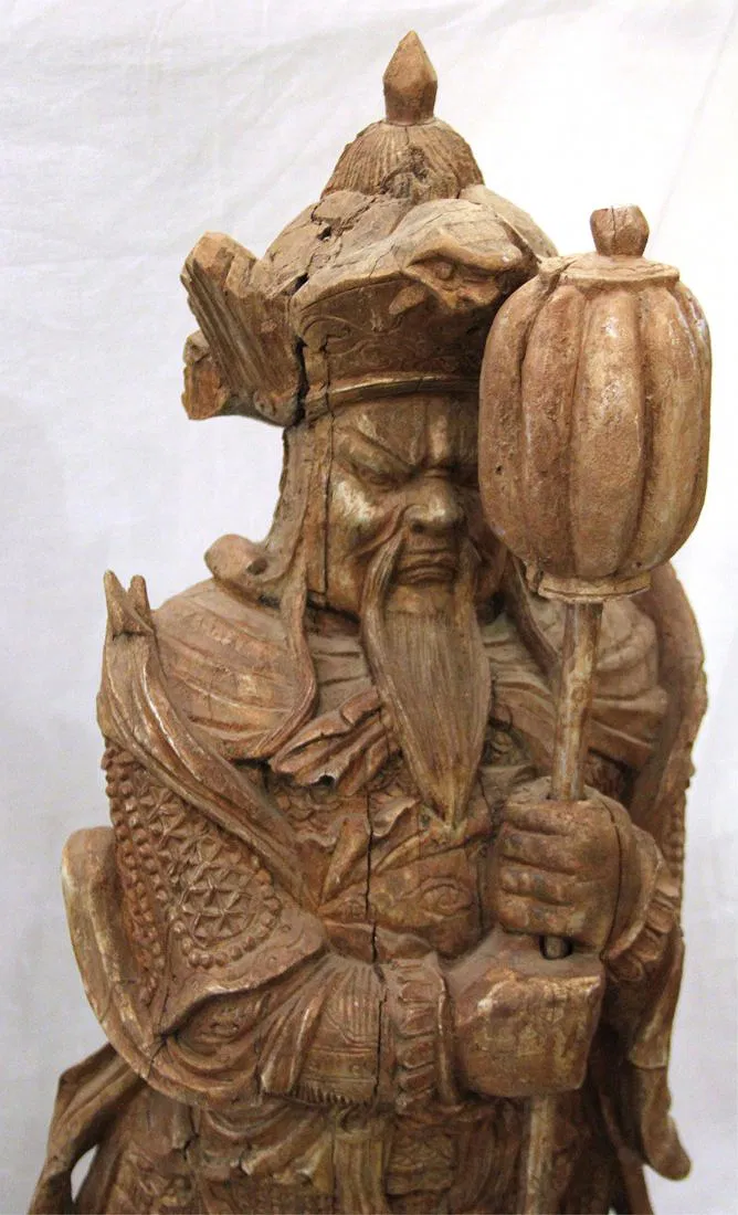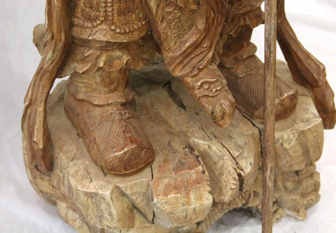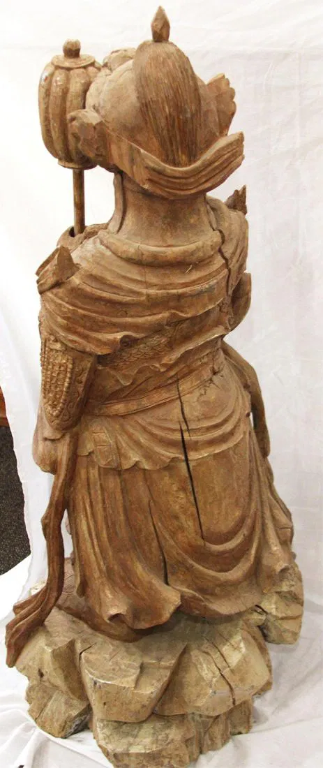 LARGE CHINESE WOODEN WARRIOR FIGURE 57″ Large carved wooden warrior figure, 57″. Standing erect on base with staff. Size: 57x 21 x 14″ Size: 57″