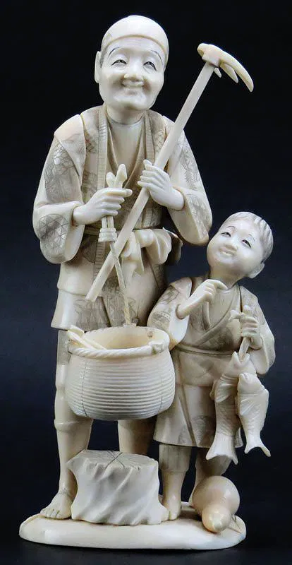 Large Japanese Carved Ivory Group Man with Hoe and Basket of Fish with Child. Signed. Loss to Basket Strings or else Good Condition. Measures 6 Inches Tall and 5 Inches Wide. Heavy.