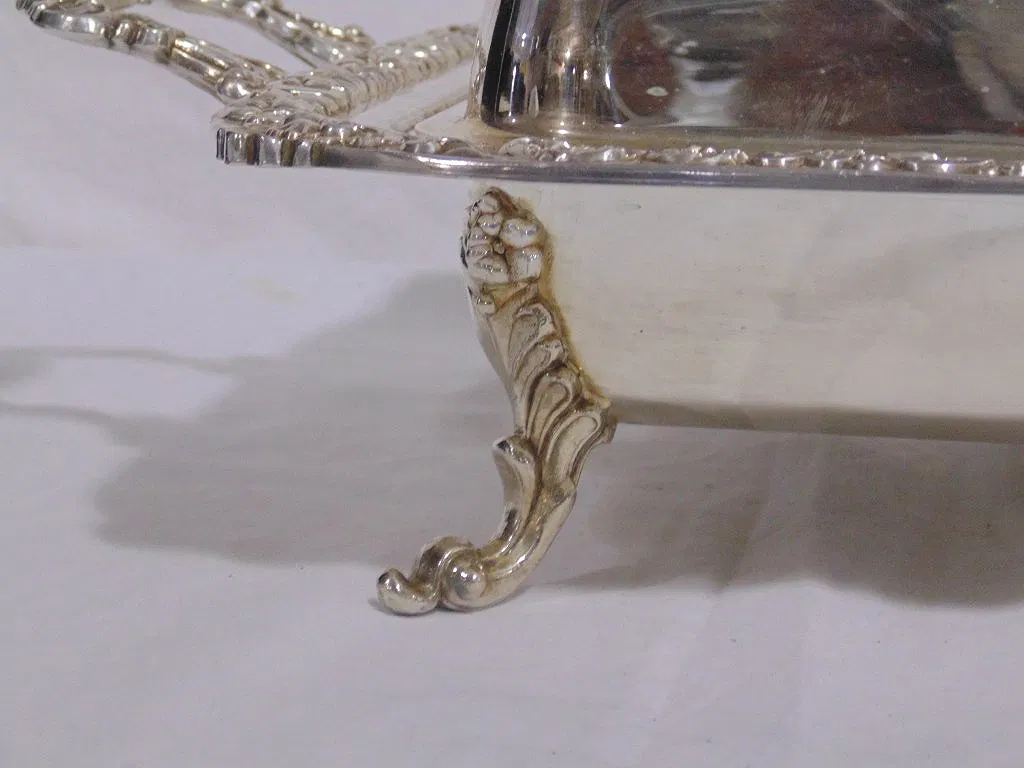 Lg.Ornate Sheffield Silver 3 Part Covered Serving Tray.Great warming tray with a fine ornate pattern throughout.Tray is app.22 1/2″ long,13 3/8″ wide and 6″ tall.Lid is missing handle as shown.