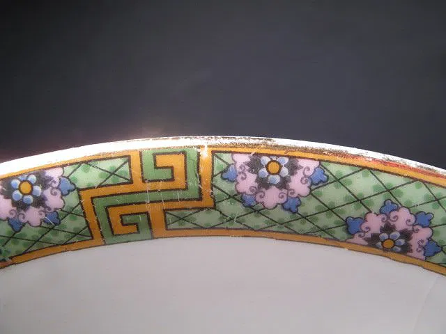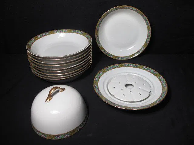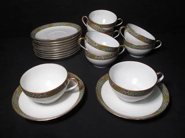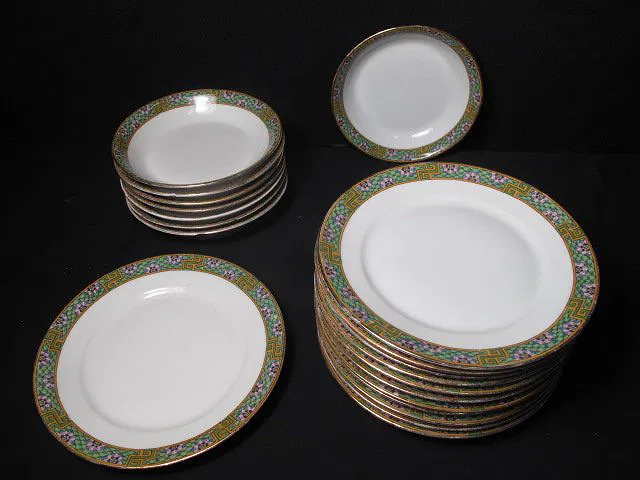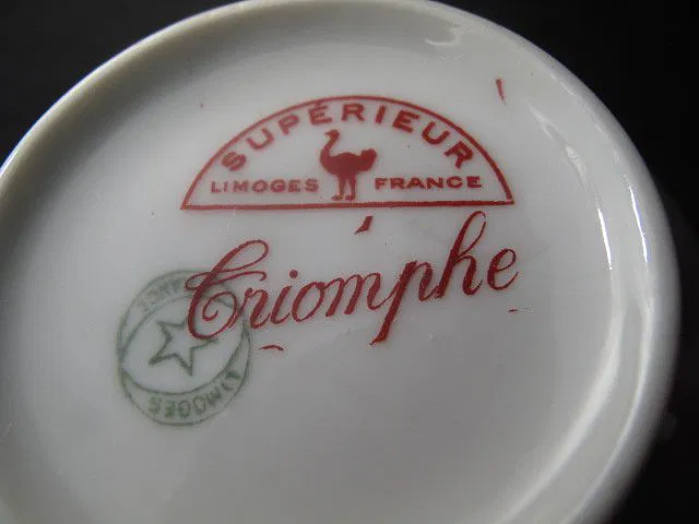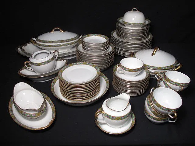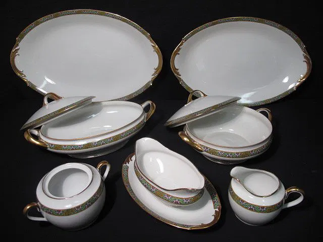 Superieur Limoges “Triomphe” porcelain dinnerware set. Floral and geometric decorated rim with gilt highlights. Includes 10 bowls (2″h x 7.5″w), 11 saucers (6″w), 9 cups (6″ w), 8 condiment bowls (1.5″h x 5.25″w), 3 lidded casseroles (4″h x 12″w), 10 plates (9.75″w), 12 saucers (6.25″w), 2 platters (2.25″h x 17″ w), and 1 gravy boat (3.75″h x 9″w). One of the bowls is chipped with wear to gilt rim. One saucer chipped. Minor scratches to finish and gilt loss, but generally good condition. Stamped on bottom” Superieur Triomphe, Limoges, France”. Shipping weight 45 lbs.