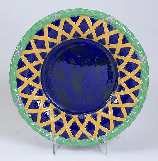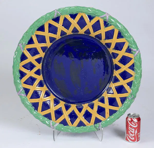 Item Details Description Majolica trellis underliner attributed to Minton, of circular form, having a green acanthus rim wrapped with purple ribbon and an inner cobalt band overlaid with mustard trellis work, the exterior done in light blue, unmarked, 3″h x 22.25″dia.
