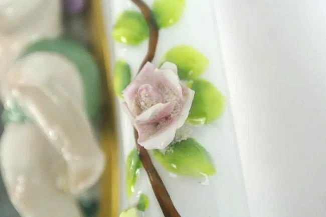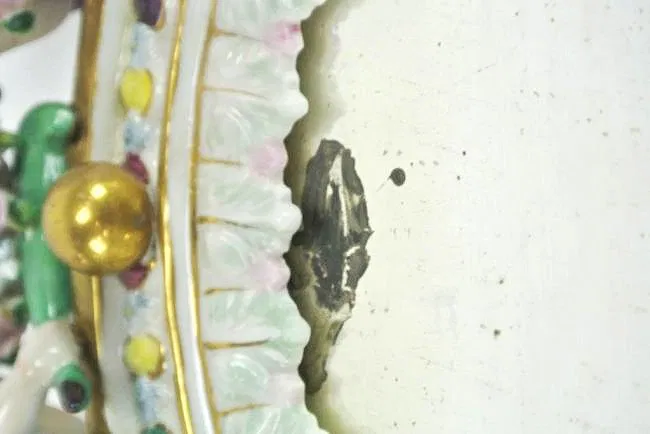 Mirror has marks under the glass and has damage to leafs and flowers. Measures 17 1/2″ long x 10″ wide.