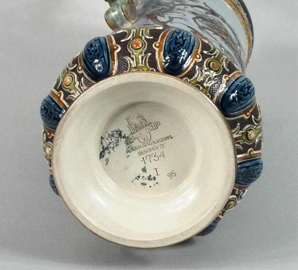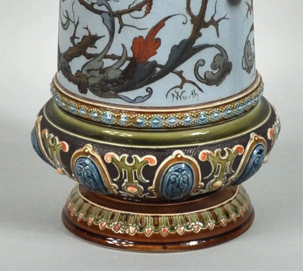 Mettlach #1734 etched stoneware and pewter mounted stein, with medieval scene signed “Christian Worth”, the underside with impressed abbey mark and mercury stamp (worn), date mark for 1895. 14 3/4″ high, 7″ wide, 5 1/2″ deep