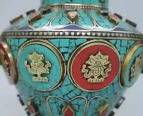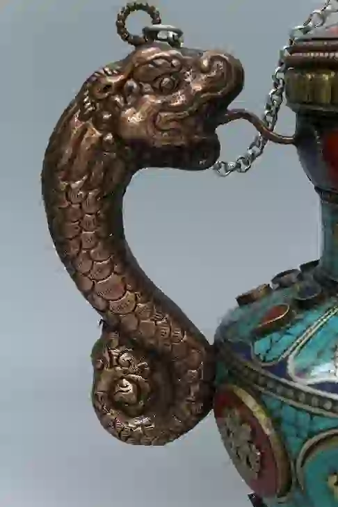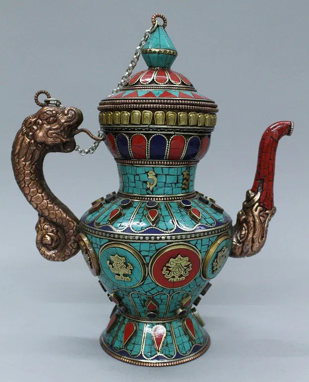 NEPAL CEREMONIAL TEAPOT TURQUOISE LAPIS AND CORAL. MEASURES H: 10″ W: 8 1/2″