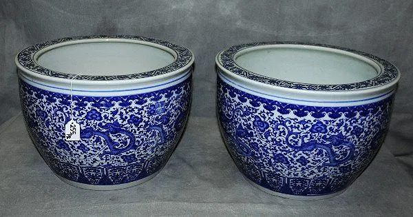 Pair Chinese porcelain blue and white fish bowls. H:11