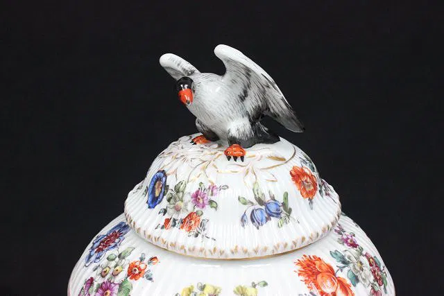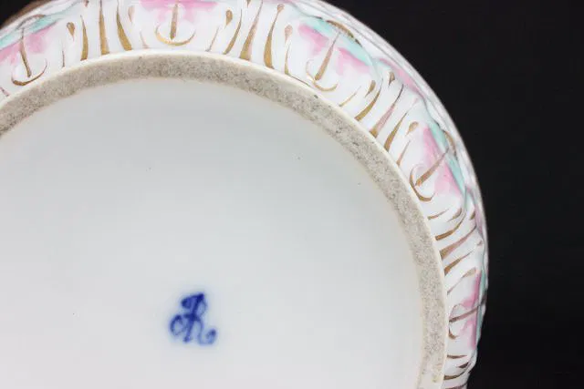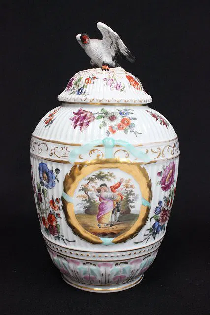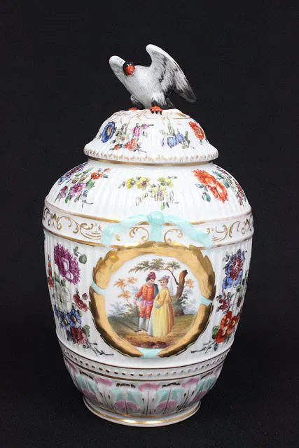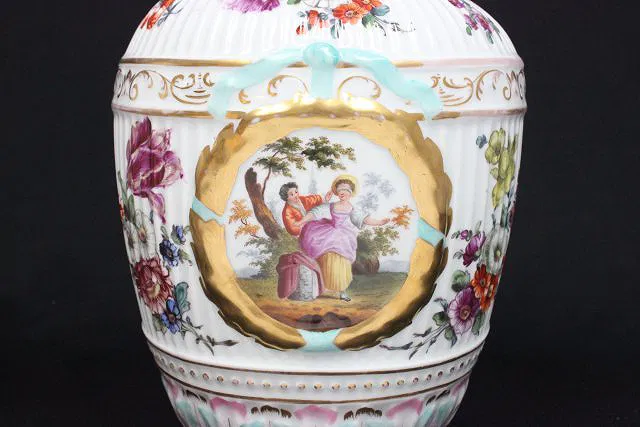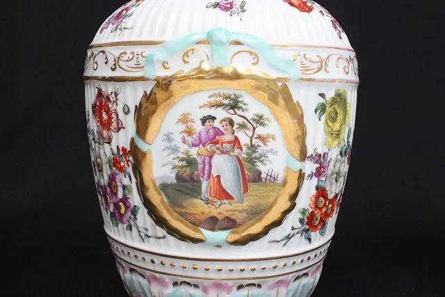 Handpainted “Flowers” & “Scene of Blind Mans Bluff & Kissing”, chips on beaks. Approx. 13.25″ H.