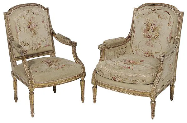 Each with leaf-carved, gessoed, and gilt frame set with Aubusson upholstery. A his-and-hers suite: