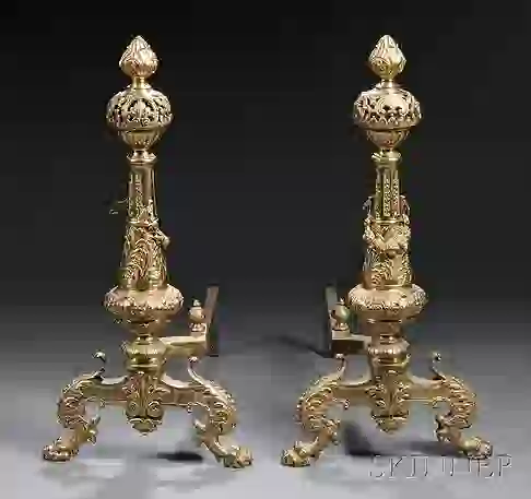 Pair of Brass Andirons, of typical form, cast with a foliate finial above a pierced sphere raised on a tapered stem decorated with foliate and strapwork registers terminating splayed lion paw feet, ht. 24 1/2, wd. 12, dp. 22 in.