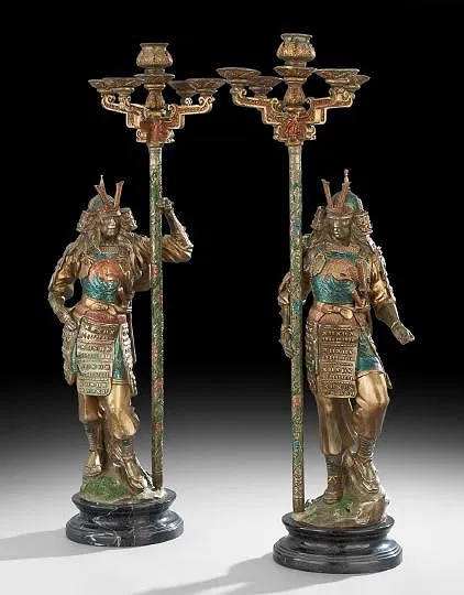 Unusual Pair of Figural Candelabra Depicting Female Samurai, the enameled, silvered bronze and marble figures depicting the Onna Bugeisha, the female master of the martial arts, and supporting standards with five-light candleholders, a central candle cup and five candle platforms, h. 28″, w. 9″, d. 9″.