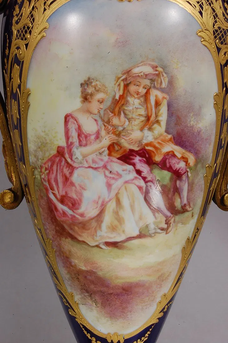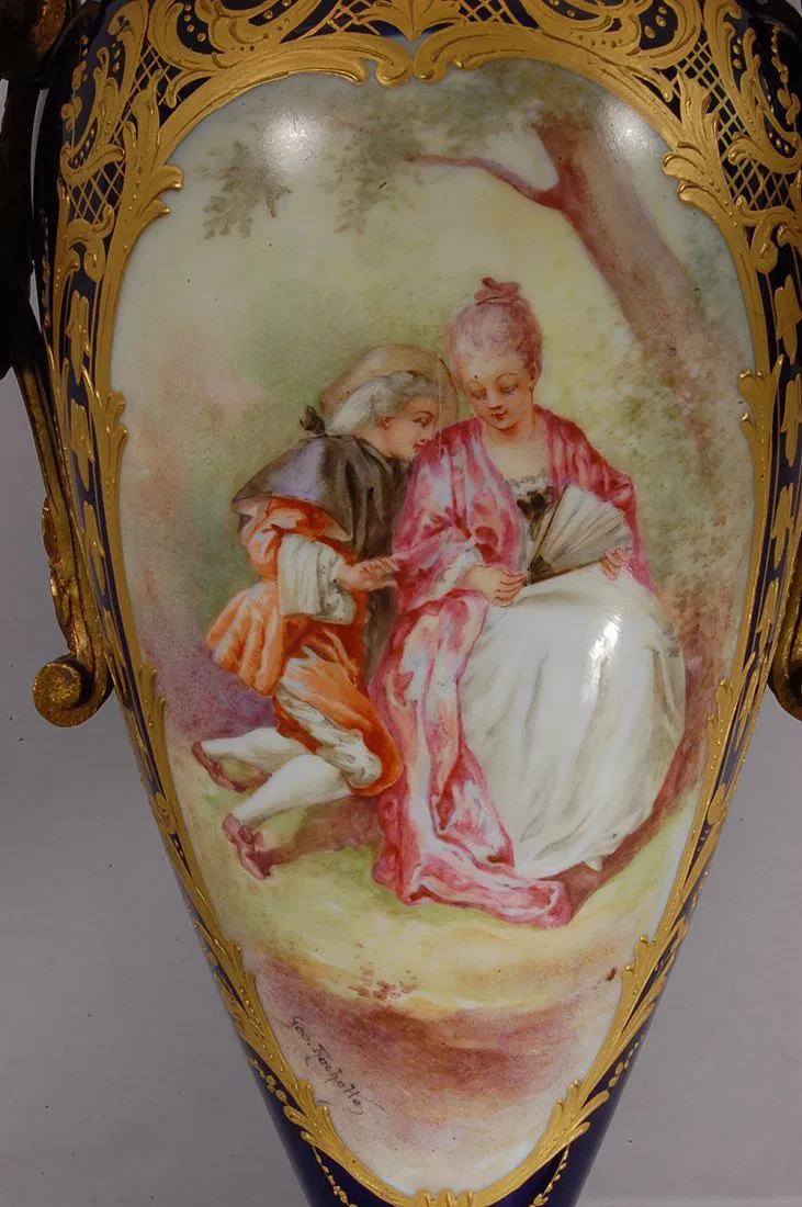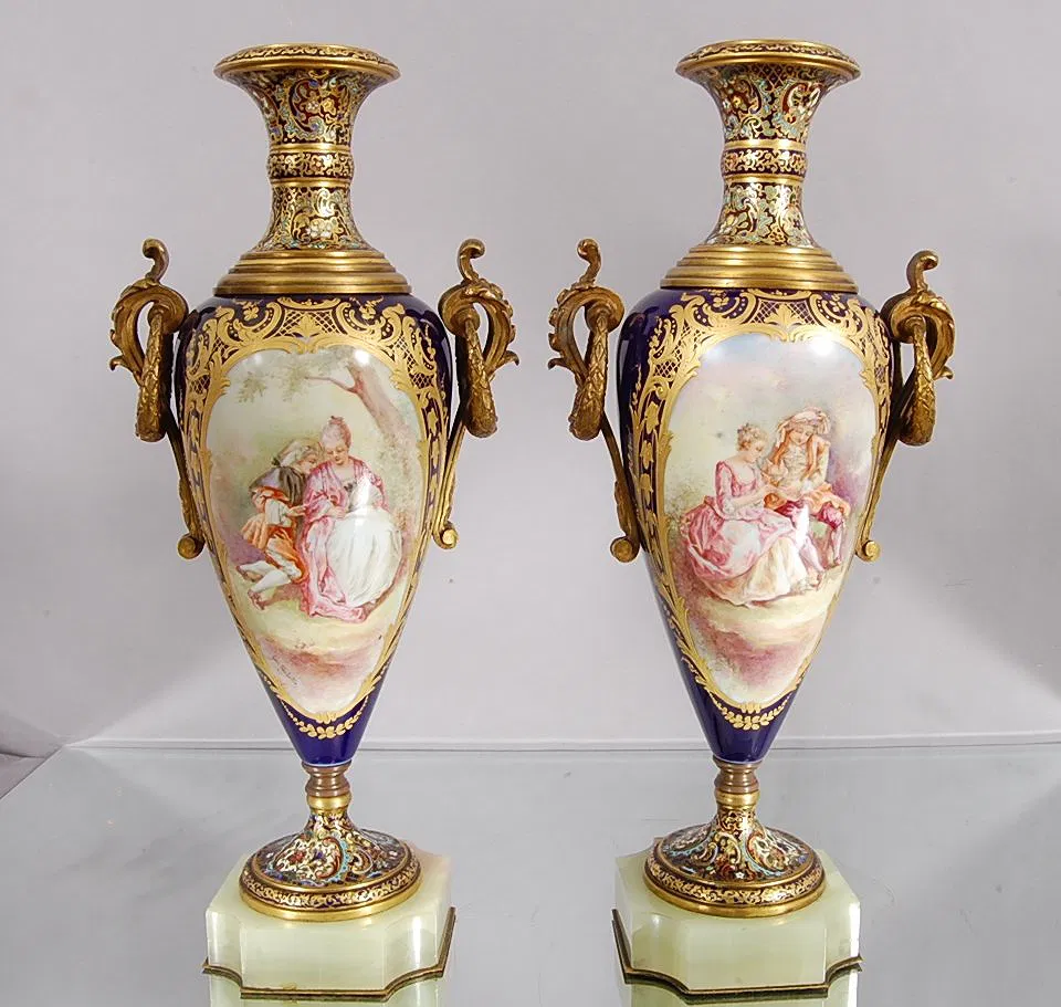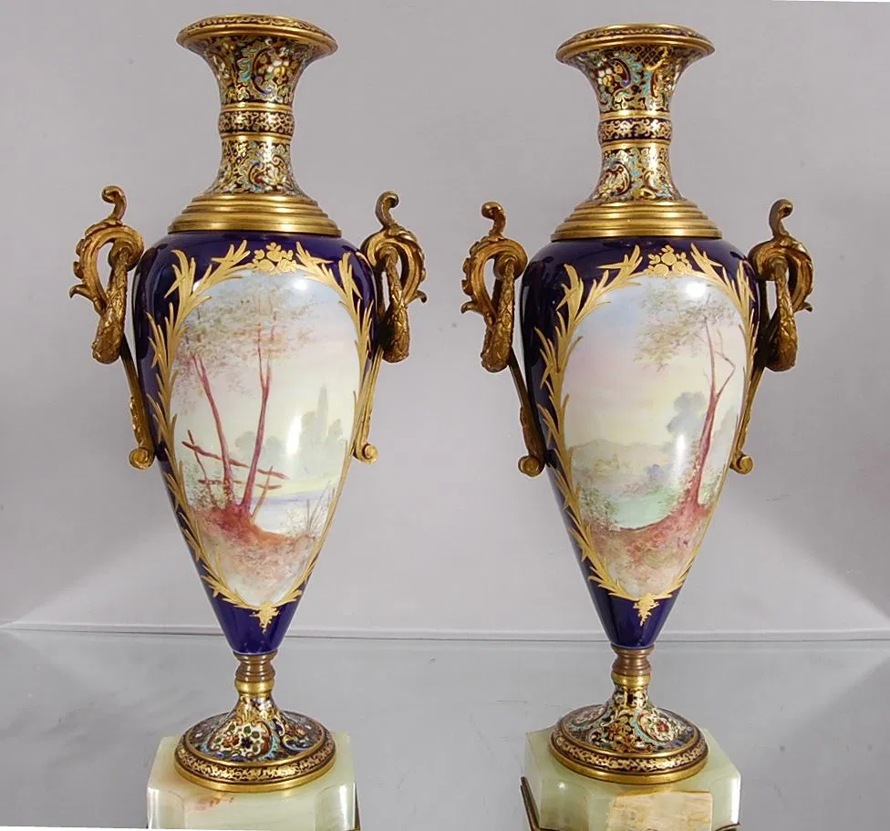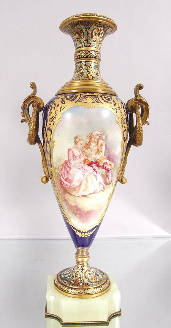 With cloisonne mounts on top & bottom. Hand Painted Romantic scenes. Front is mountain scene. Bronze handles. Artist signed Geo Rochelle Signed on Bottom. France. Ca. 1890