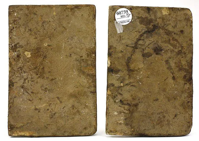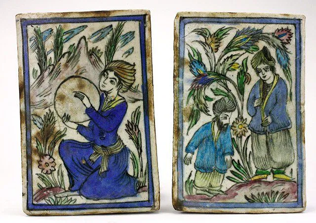 With a woman holding a tambourine and an old man with a young woman. The figures are raised from the tile base and heavily colored under the glaze. H: 7 5/8 in. x W: 5 1/8 in.