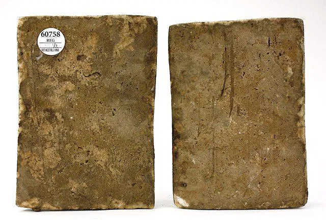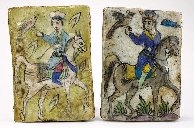 A hunter on horseback depicted on each tile with hunting falcons on their arms. The figures are raised from the tile base and heavily colored under the glaze. H: 7 1/4 in. x W: 5 1/4 in.