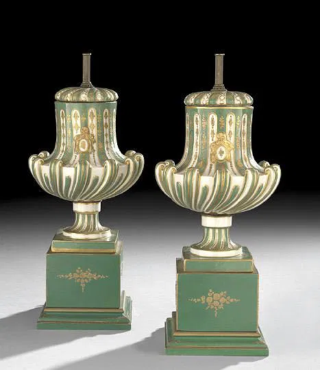 Pair of Sevres-Style Urns Mounted as Lamps, the pear-shaped lobed bodies decorated with alternating cascades of raised gilt bellflowers on a white ground and raised gilt roses on an apple green ground, resting on a conforming wooden base with matching decoration, h. 29-1/2″, w. 7″.