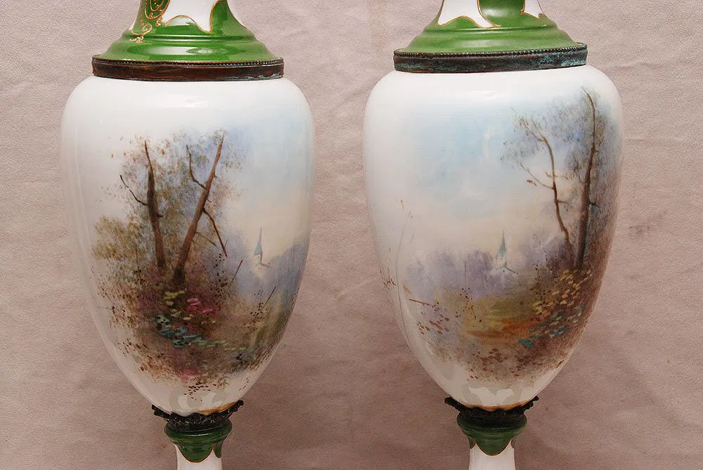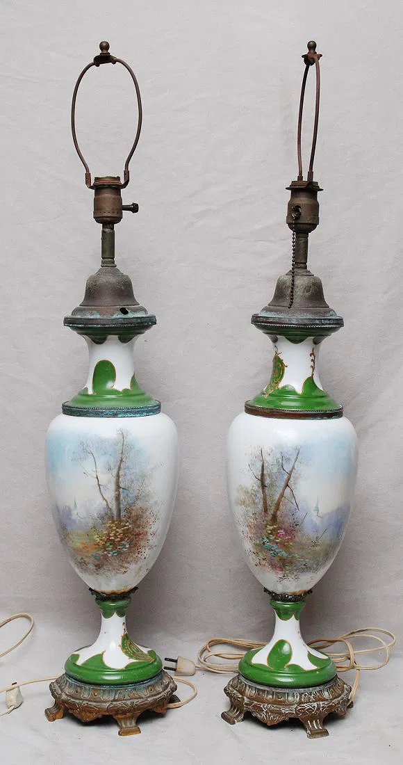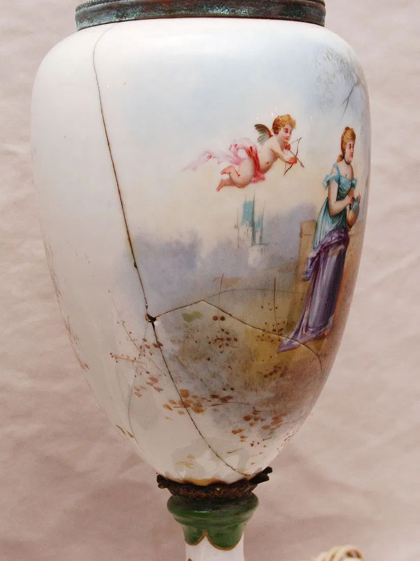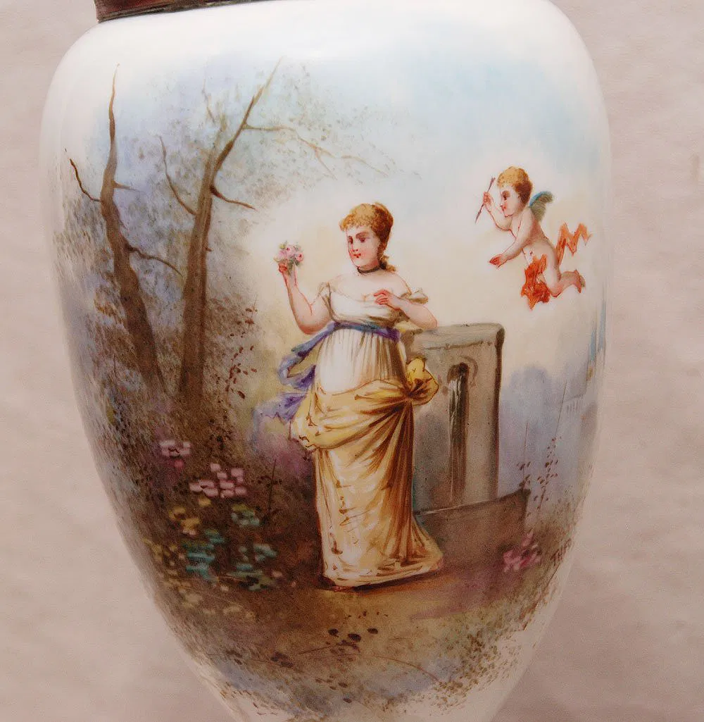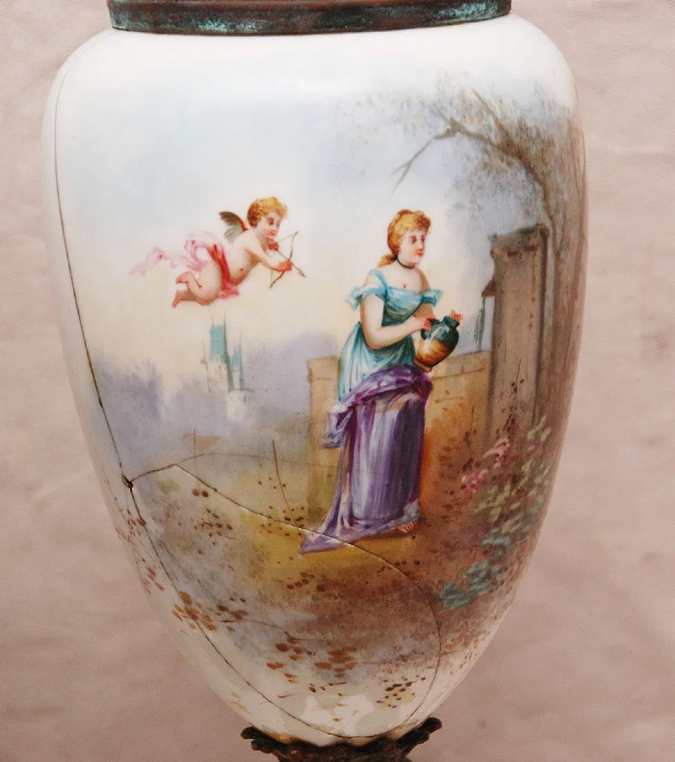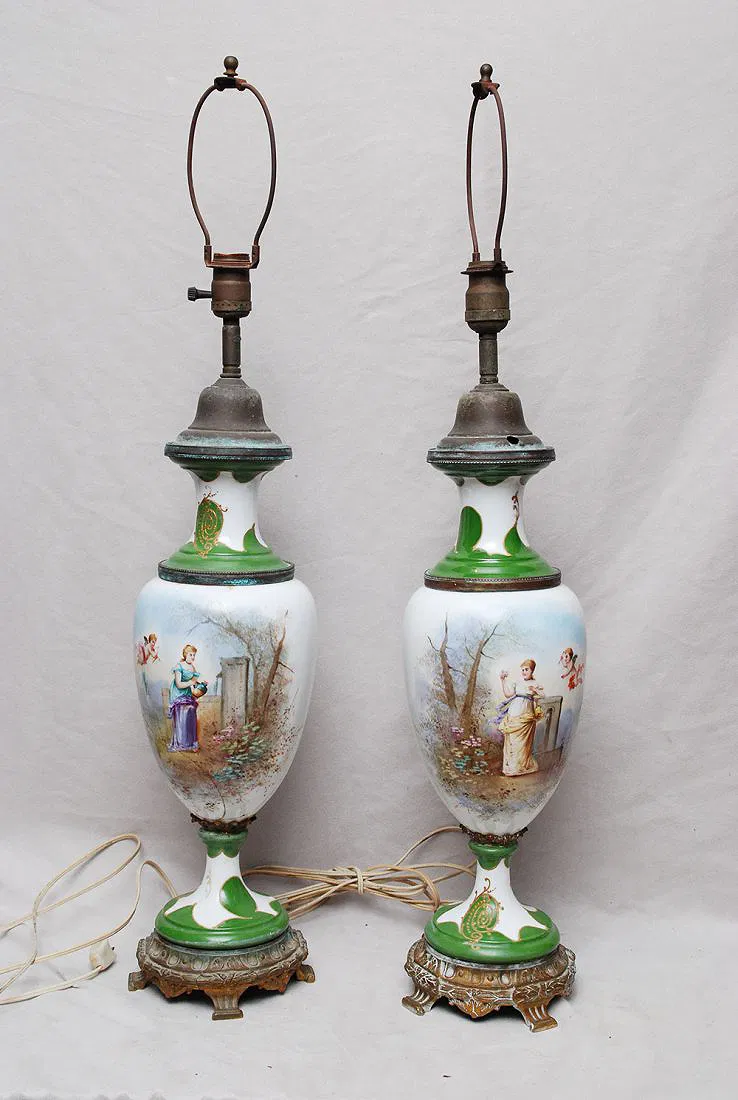 Pair of Sevres urn form lamps, angel and maiden motif, lamp 22″h (one with large hairline cracks) overall 30″h