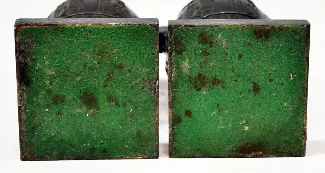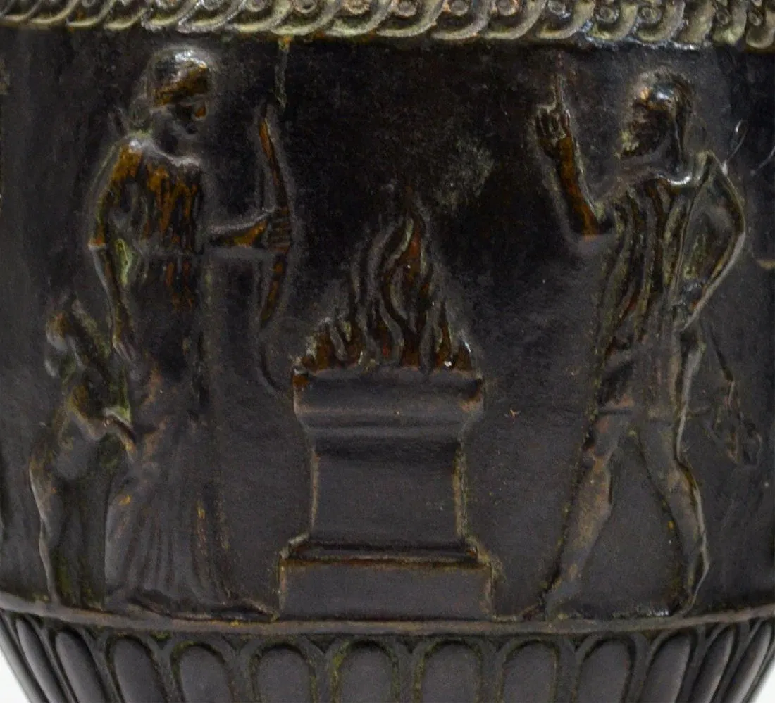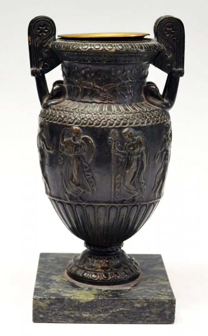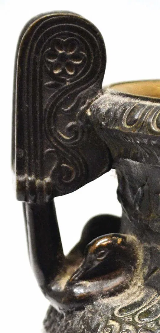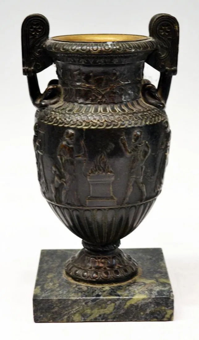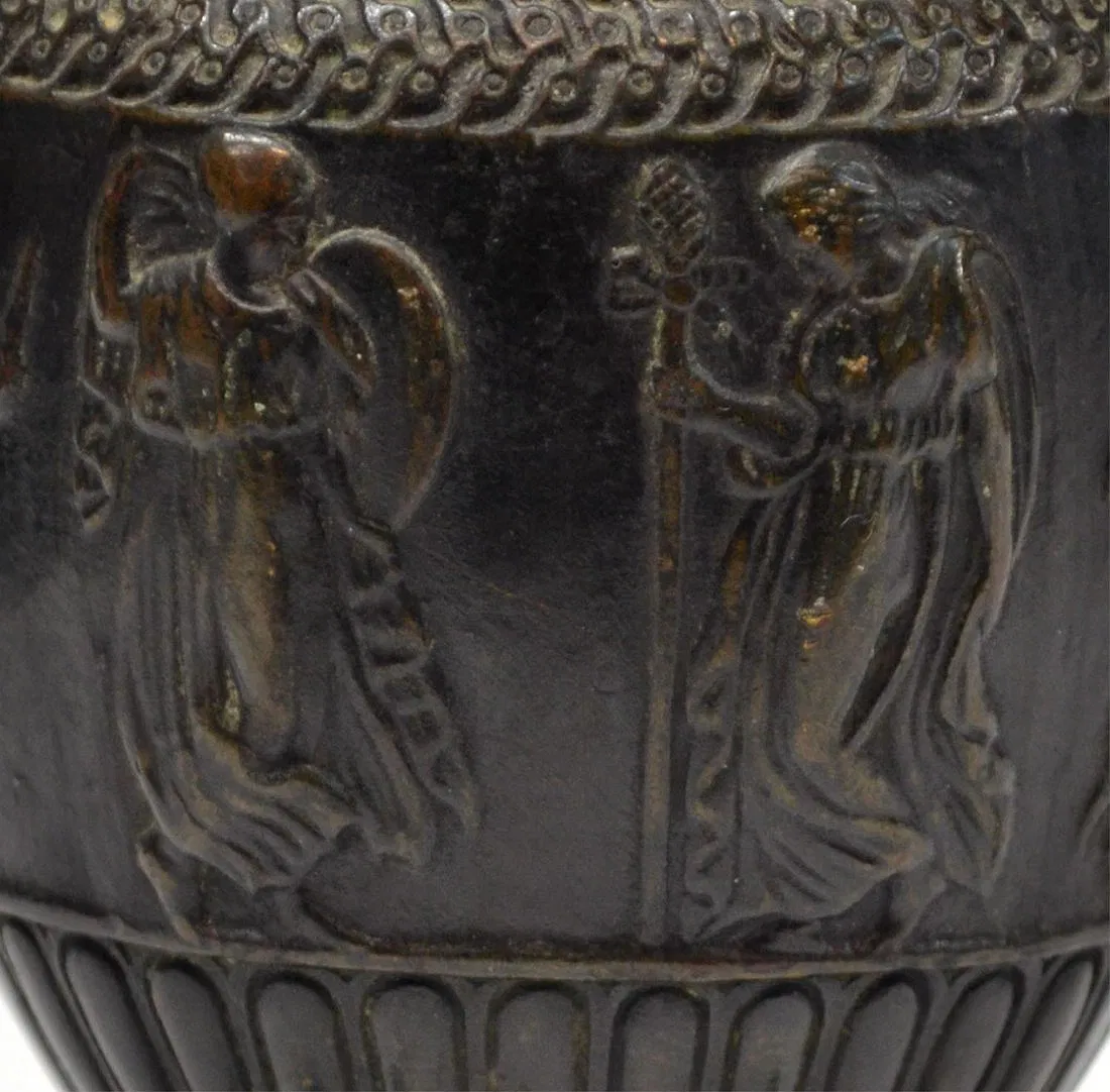 (pair) Diminutive Empire style patinated bronze urns, early 20th c., the neck having a grape and vine motif, flanked by scrolled swan handles, the body in relief with classical figural scene, removable brass insert, each rising on green marble bases, 8″h, 4.25″w, 4″d, 8.5lbs total