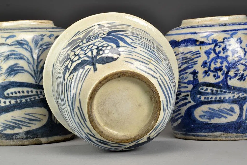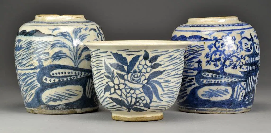 To include a pair of ginger jars painted to depict figures in boats fishing together with a planter depicting flowers, largest is 8.25″H, circa late 19th/early 20th century.