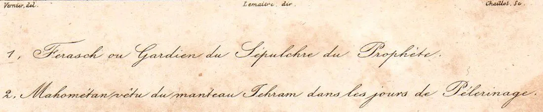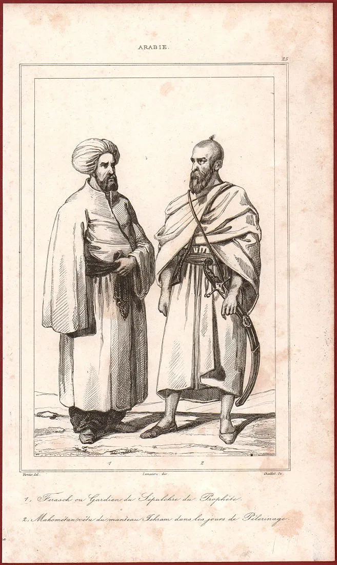 Item Details Description Prophet Guardian of the Tomb. Pilgrimage Mohammedan from Tehram wearing the coat. Iran. 1847. Print of steel engraving titled „Ferasch ou Gardien du Sepulchre du Prophete. Mahometan vetu du manteau Tehram dans les jours de Pelerinage.“. Drawn by Vernier. Engraved by Chaillot. From „Arabie, par M. Noel Desvergers, vice-president de la societe de geographie, Avec une carte de L‘arabie et note sur cette carte, par M. Jomard, membre de l‘institut. Paris, Firmin didot freres, editeurs, imprimeurs de l‘institut de France, 1847. Mohammedan is a term for a follower of the Islamic prophet Muhammad. It is used as both a noun and an adjective, meaning belonging or relating to, either Muhammad or the religion, doctrines, institutions and practices that he established.Tehran is the capital and largest city in Iran and Tehran Province. With a population of around 9 million in