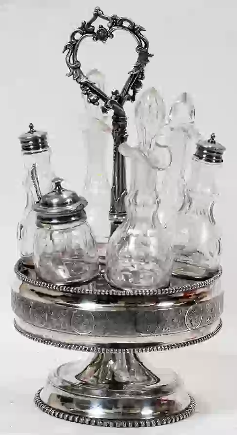 REDFIELD & RICE, NEW YORK SILVERPLATE REVOLVING CRUET STAND, 19TH C., H 14″:Round silverplate revolving cruet stand with floral band and beaded rims, centered by a handle, fitted with 6 glass bottles; stamped “Redfield & Rice, New York, 665” underneath.