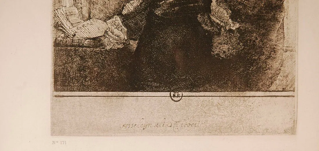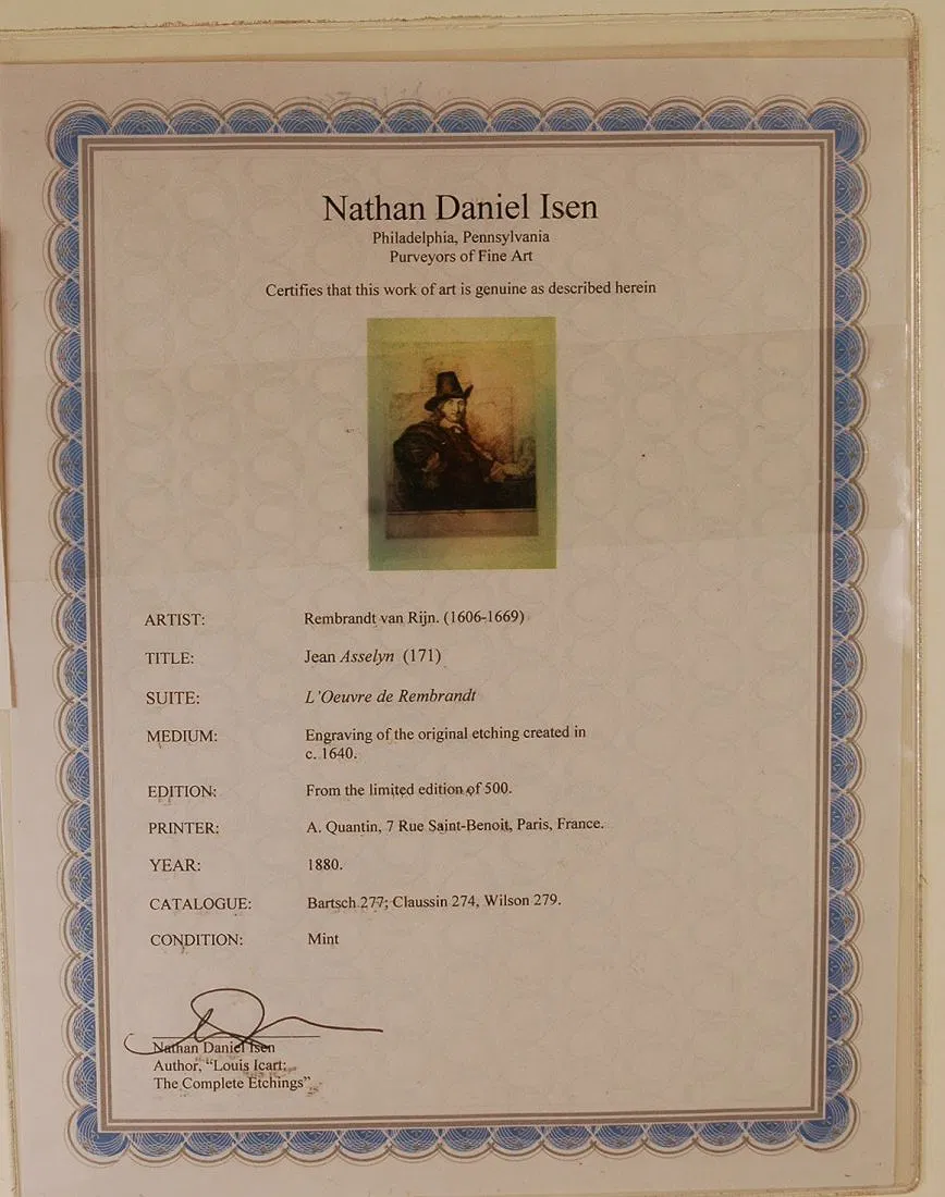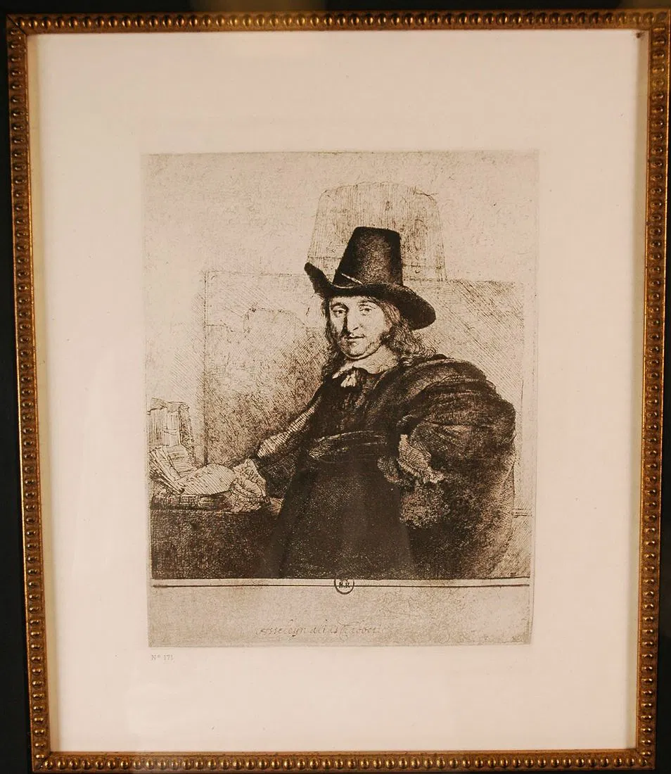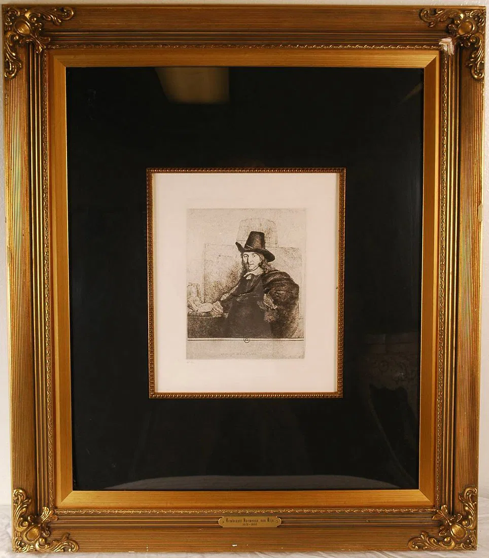 After Rembrandt (1606-1669) “Jean Asselyn” engraving of the original etching created in 1640. From the limited edition of 500 Year 1880. Framed, minor damage to inside corner of frame. 26″W x 30.5″H