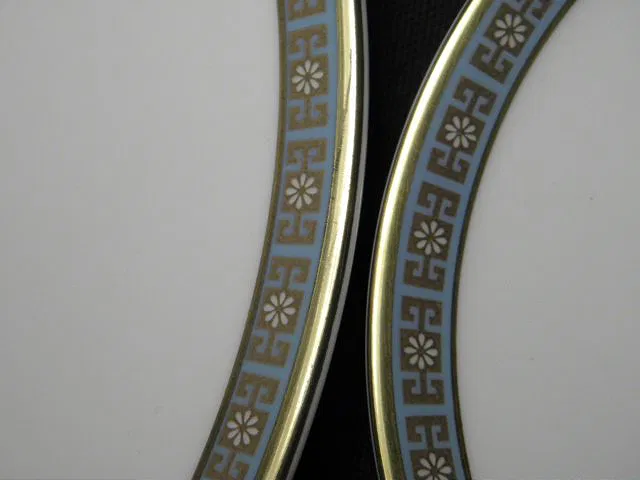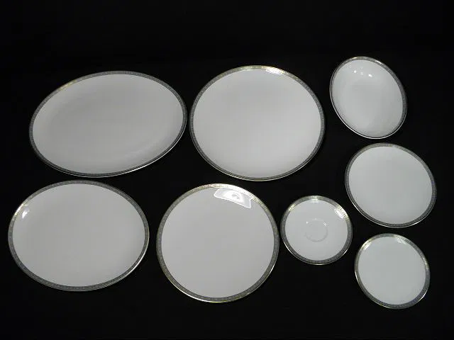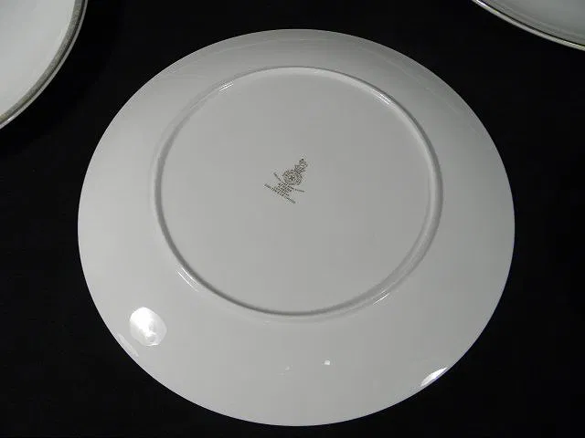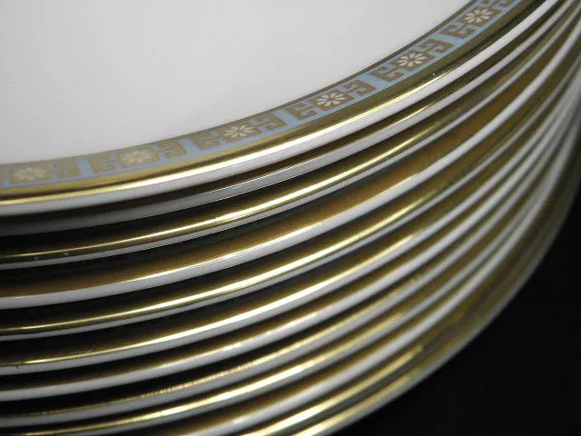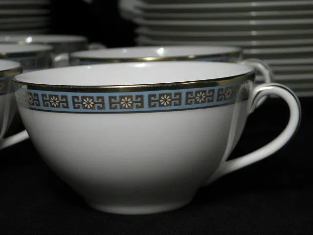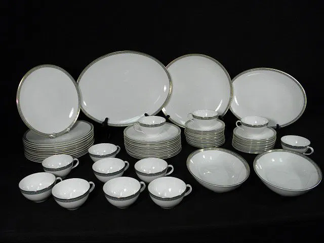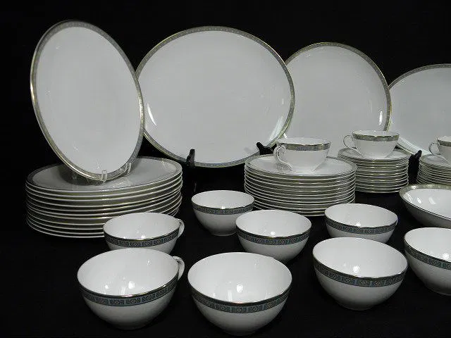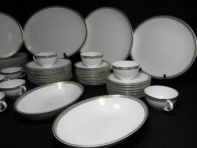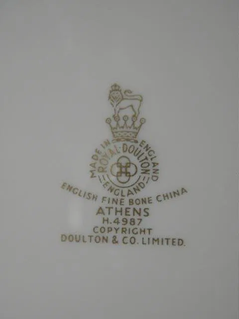 Royal Doulton porcelain dinnerware service for twelve in the “Athens” pattern. 65 total pieces, Includes (12) 6.15″ saucers, (12) 2.25″ tall cups, (12) 10.25″ plates, (12) 6.25″ plates, (12) 8.25″ plates, (2) 9.75″ oval serving bowls, (1) 13″ oval serving platter, (1) 16″ oval serving platter, and (1) 13″ round serving plate or salver. Each piece is marked on base “Royal Doulton England, Made in England, English Fine Bone China, Athens, H.4987, Copyright Doulton & Co Limited”. Condition: good, no chips or cracks, see images. Total shipping weight 48 lbs.