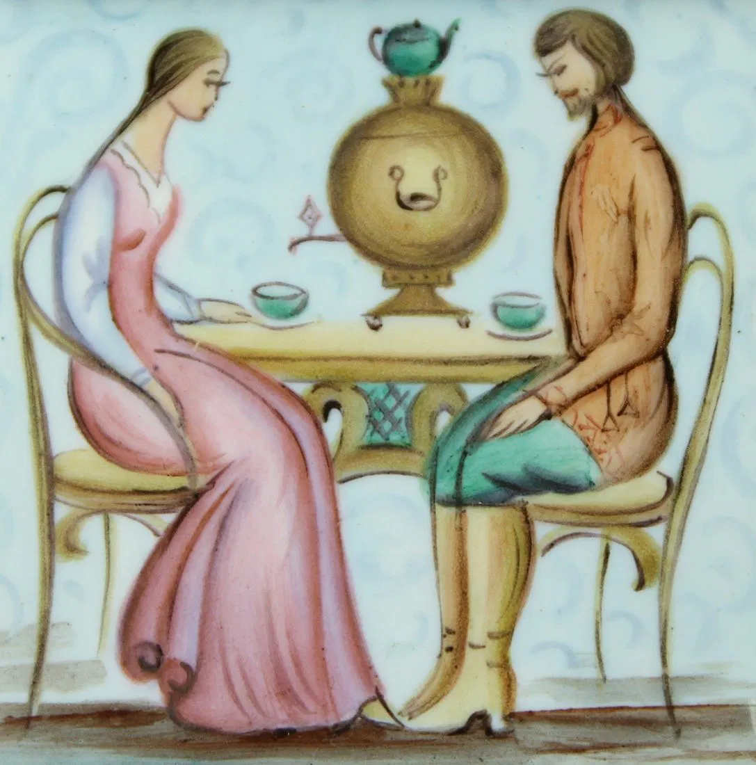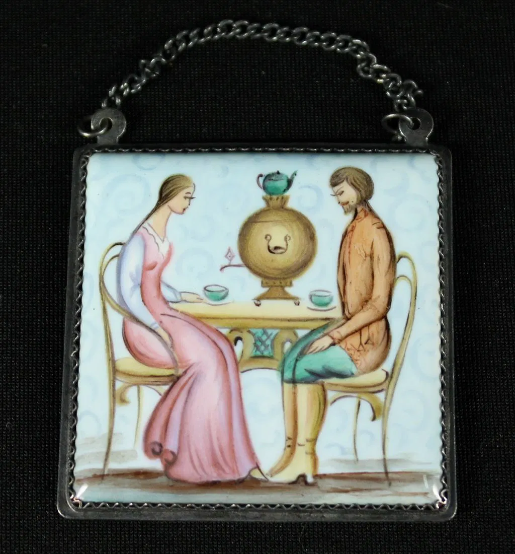 RUSSIAN ENAMEL PLAQUE WITH CHAIN. MEASURES H: 2 1/4″ W: 2 1/4″