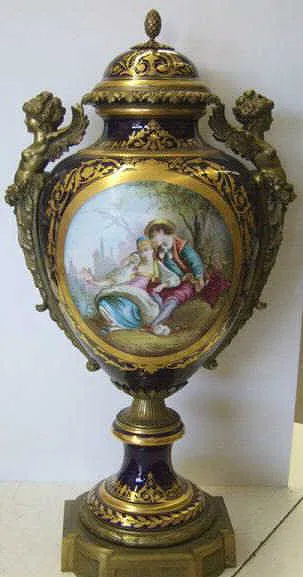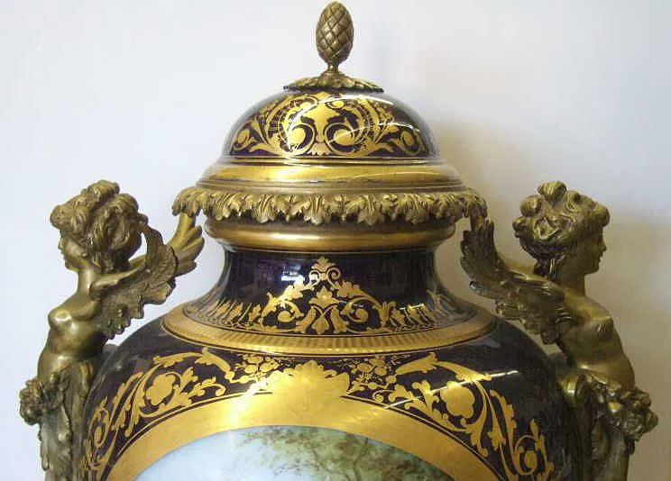 The cobalt blue ovoid body painted with two reserves, one depicting a romantic scene, the other a river landscape within elaborate gilding, indistinctly signed, mounted at top with winged figural and foliate handles, raised on removable porcelain and gilt bronze base, bearing Sèvres “Louis Philippe – 1844” printed mark, destination (Chateau des Tuileries) and date mark S.37. Height 73.7 cm.