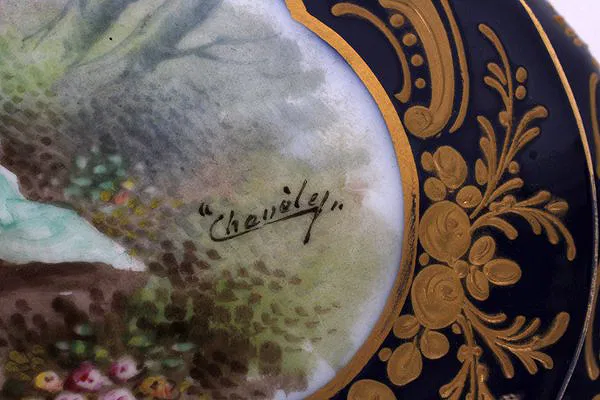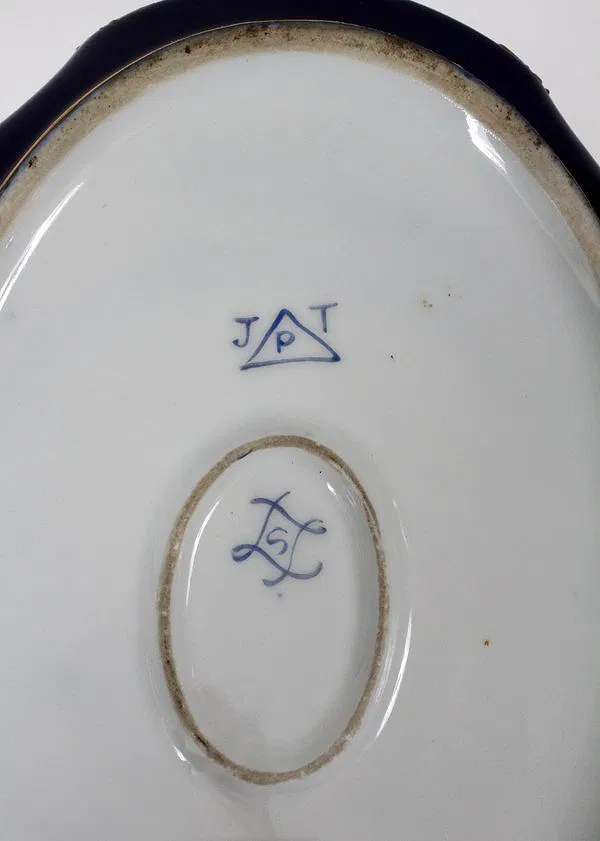 SEVRES HAND PAINTED PORCELAIN COVERED OVAL BOX, H 3 1/4″, W 6″, L 7 1/2″:Cobalt blue ground with raised gilt foliate and swag design; hand painted courting scene on the cover is illegibly signed, “Ch___ly”. Bottom marks in blue above the glaze consist of interlacing ‘L’s’ containing an ‘S’ and a triangle containing a ‘P’ and flanked by a ‘J’ and a ‘P’.