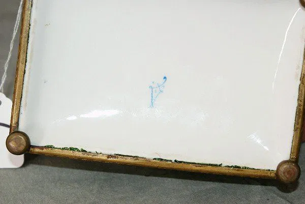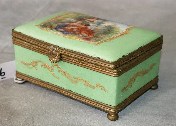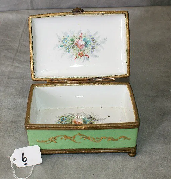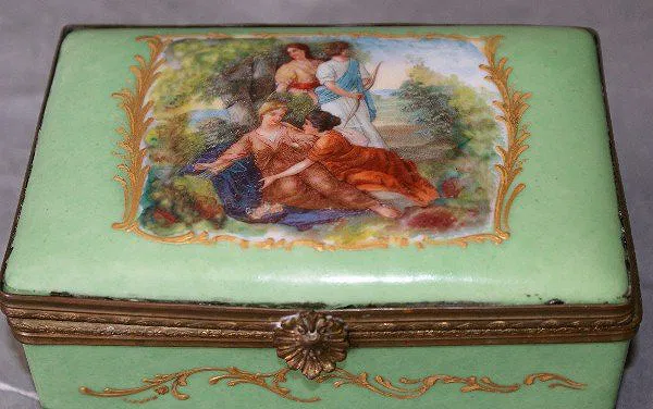 Sevres porcelain and bronze covered box with sevres mark on bottom and marked france on bronze. H:3.25″ L:6″ D:4″
