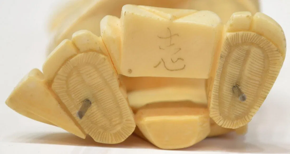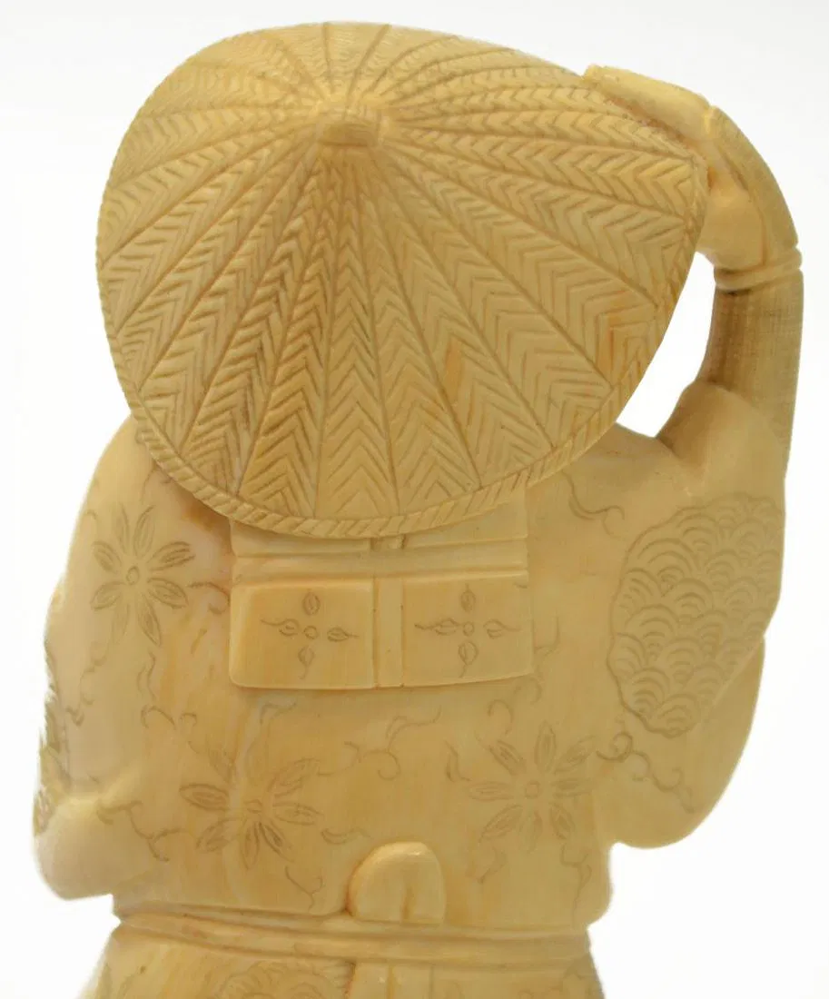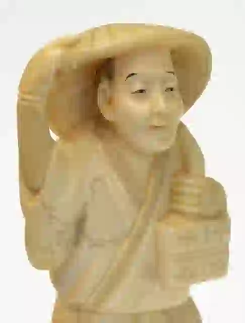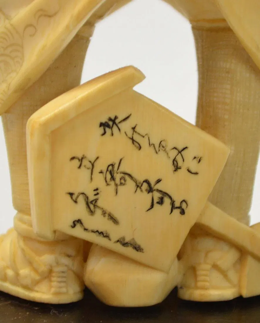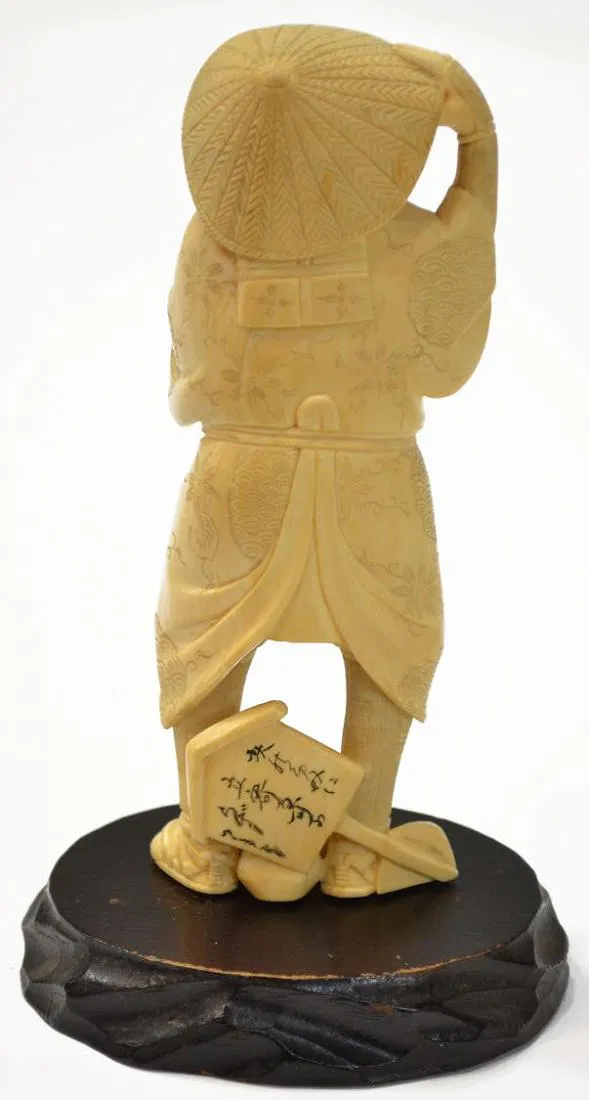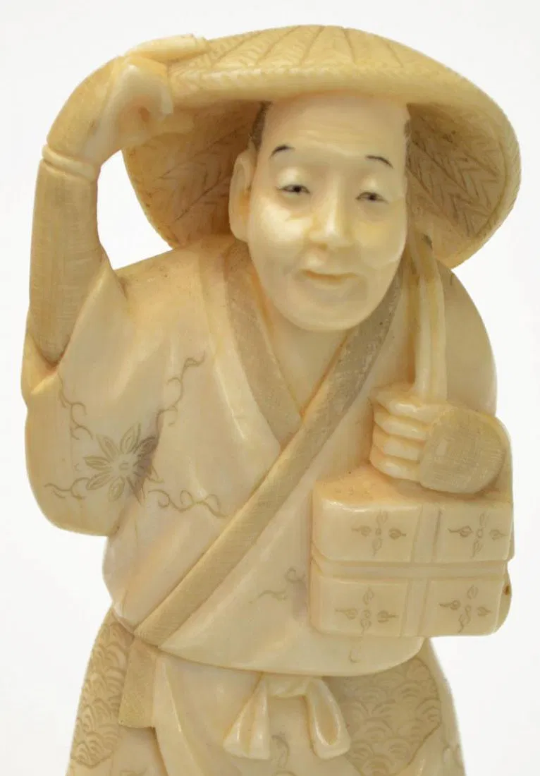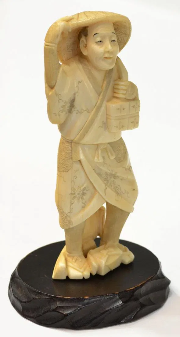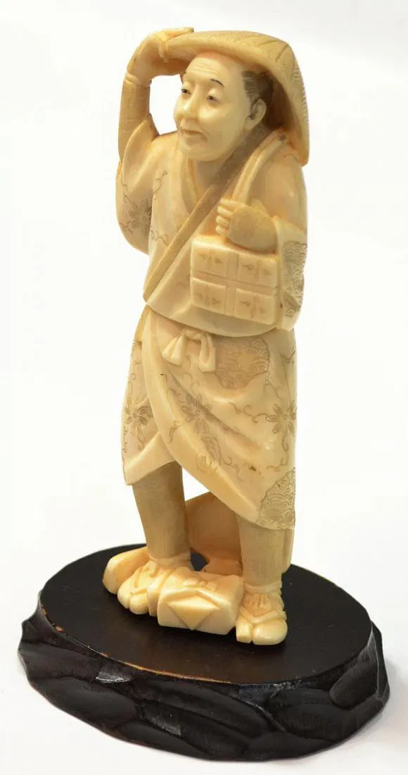 International Shipping Is Not Available On This Lot*** Carved Japanese standing ivory figure on later stand, a man with one hand on his hat holding packages in his other hand, on the backside a sign with characters, signed underfoot, ivory: 5″h, 2″w, 1″d, wood stand: .75″h, 3.25″, 3″d,