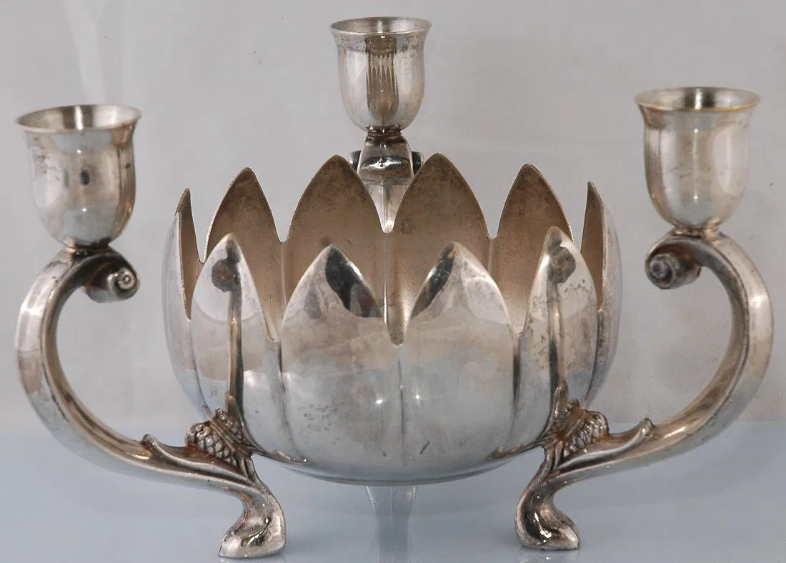 Silver plated candle holder. Holds three candles and also has bowl basin. Stamped on bottom “Leonard SILVER PLATE”. 5″ x 7.5″.