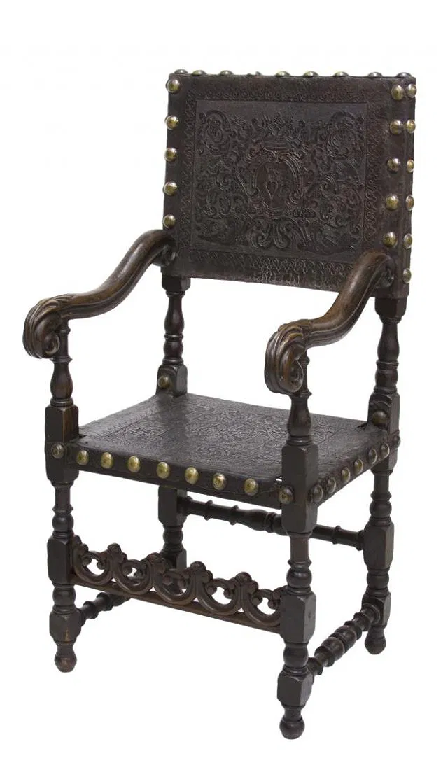 Spanish Baroque arm chair, 18th/19th c., having large nail heads securing the foliate embossed leather back and seat, shaped arms ending in carved acanthus handholds, rising on turned and block legs joined at front by a later carved stretcher, restorations, 46.5″h, 21.5″w, 20″d *Provenance: From the estate of Don Yarton (Ohio, Texas, 1941-2013), internationally recognized antiques dealer and designer who operated shops in Dallas, Houston and San Antonio*