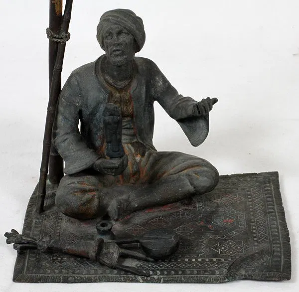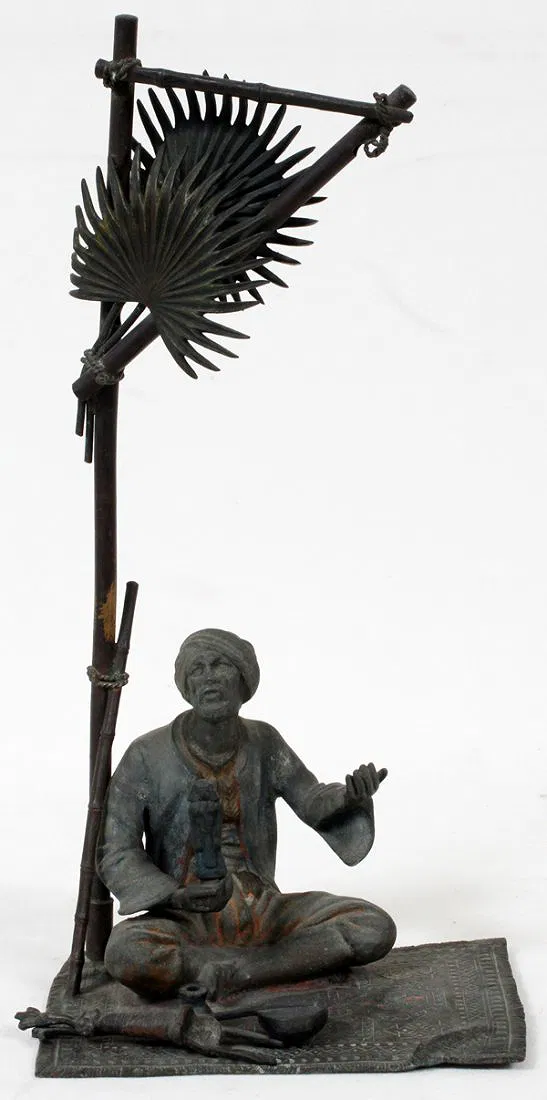 AUSTRIAN SPELTER FIGURAL LAMP IN THE MANNER OF FRANZ BERGMAN, H 13 1/2″, L 6 1/2″:Fashioned as a seated Arab man holding an Egyptian pharaoh statuette beneath a palm tree. Signed “BK” enclosed in a rectangle (see photo). Circa 1900.