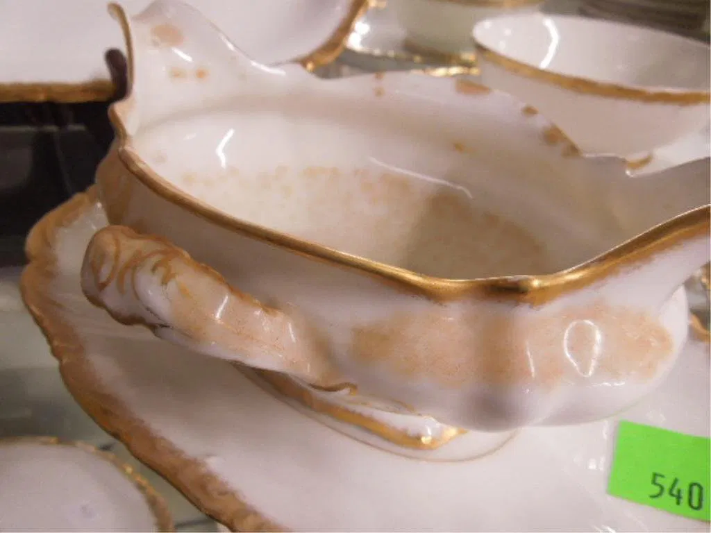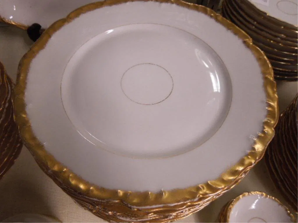 T & V Limoges china service, shaped and gilt borders, early 20th C., includes: rectangular platter, 2 graduated oval platters, bread server, fruit bowl, gravy boat, 2 small serving bowls, 12-9 1/2″ dinner plates, 12-8 1/2″ luncheon plates, 14 – 7 1/4″ plates, 12-71/2″ soup bowls, 13 bread and butter plates, 17 dessert bowls, 20 saucers, 4 bouillon cups, 4 cups, 5 butter pates. CONDITION: Few chips and hair lines.