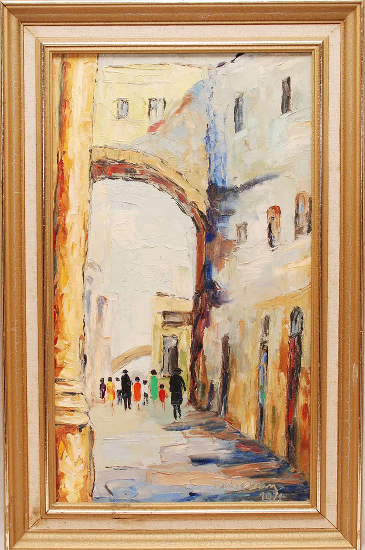 Terese Dan (Romanian, 1913-1976) oil on canvas, street scene with figures in old Jerusalem, signed lower right, 1971, in gold painted wood frame