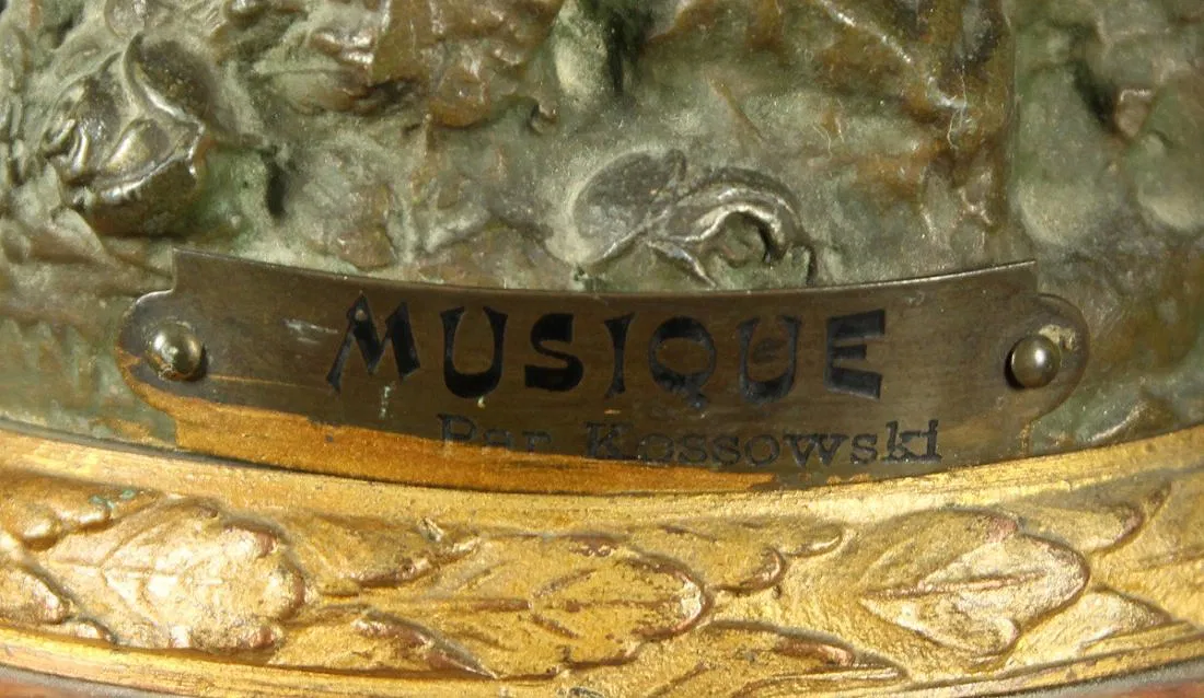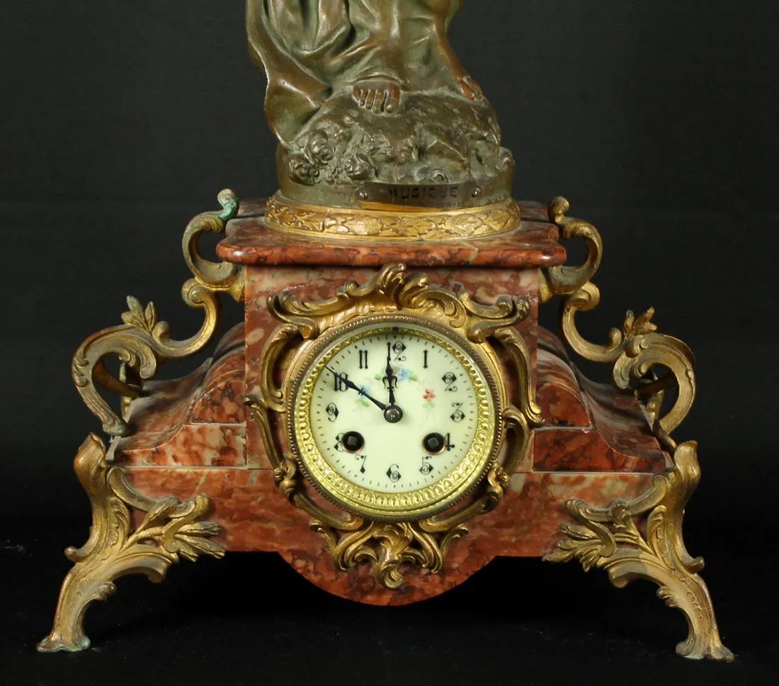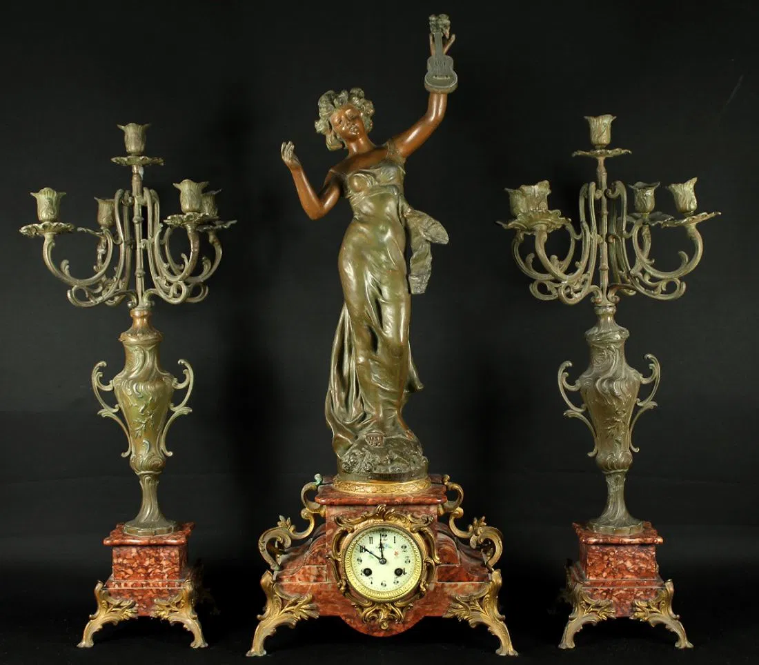 Three Piece Patinated Spelter and Rouge Marble Clock Set, c. 1900, the clock surmounted by a large figure of “Musique” after Kossowski, over a floral decorated enamel dial, time and strike, together with a matching pair of five light candelabra on relief urn supports on rouge marble bases, Clock- H.- 30 3/4 in., W.- 13 in., D.- 7 3/4 in., Candelabra- H.- 25 3/4 in., Dia.- 12 in.