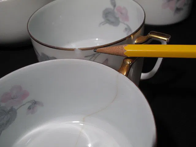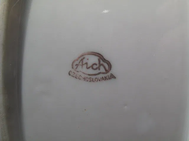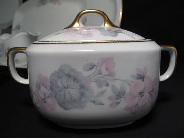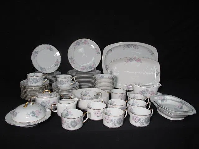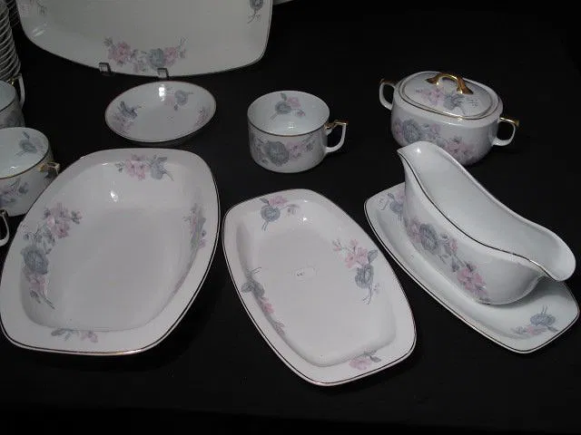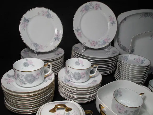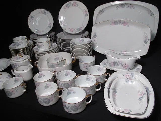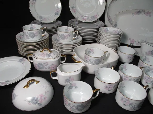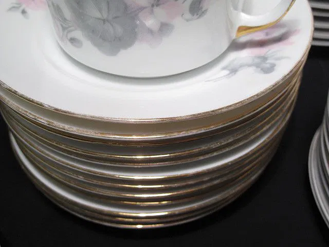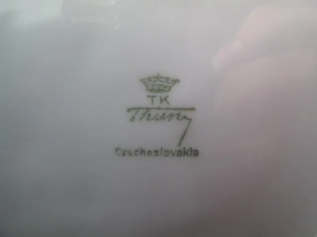 TK Thuny Czechoslovakian gilt dinnerware set. Circa 1926-1928. Includes 78 pieces total. Includes (12) saucers 6.5″, (10) plates 6.5″, (12) bowls 1.25″ tall x 5.5″, (12) salad plates 8″, (12) dinner plates 9.6″, (11) cups 2.25″ tall x 4.5″, a covered butter dish measuring 4″ tall x 7.75″, a gravy boat 3.5″ tall x 9″ long, a creamer 3.25″ tall x 5″, a lidded sugar bowl 4″ tall x 6.5″, a casserole dish 2.5″ tall x 9.5″ long, (2) serving dishes measuring 9″l x 5.5″w and 10.25″long x 7.75″ wide, and (2) serving platters measuring 14.5″ x 9.25″ and 18″ x 12.5″. Two of the cups have hairline cracks and chips in the rims. One bowl, and one salad plate also have hairlines. Some gilt loss at the rims, and scratches. Overall good condition. Marked on bottom “TK Thuny Czechoslovakia”. See images for details. Shipping weight 44 lbs.