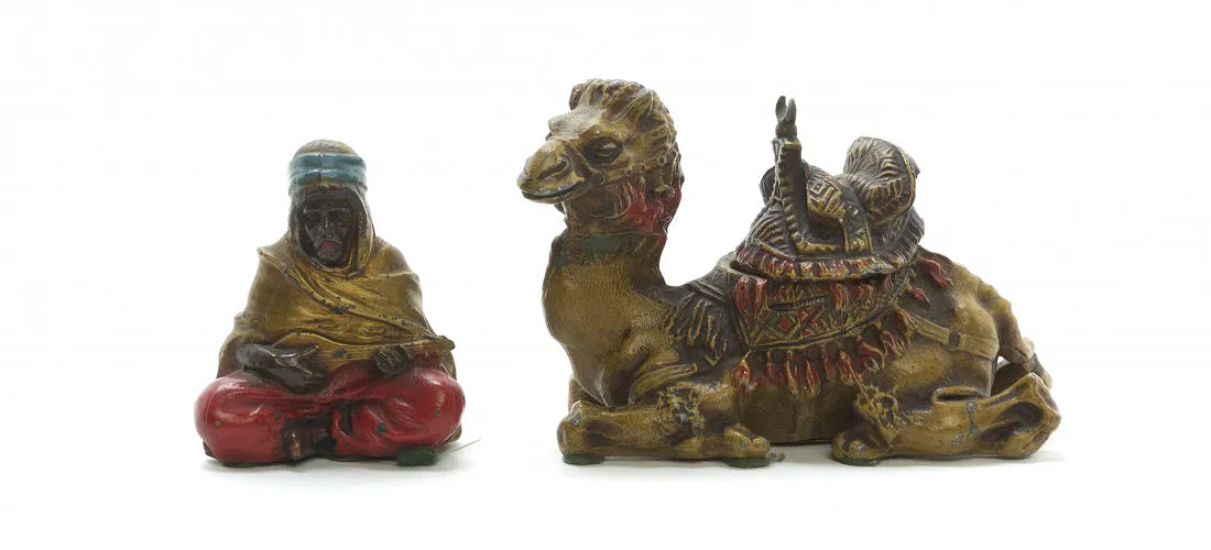comprising a camel inkwell in a recumbent pose and a seated Orientalist figure playing a mandolin.