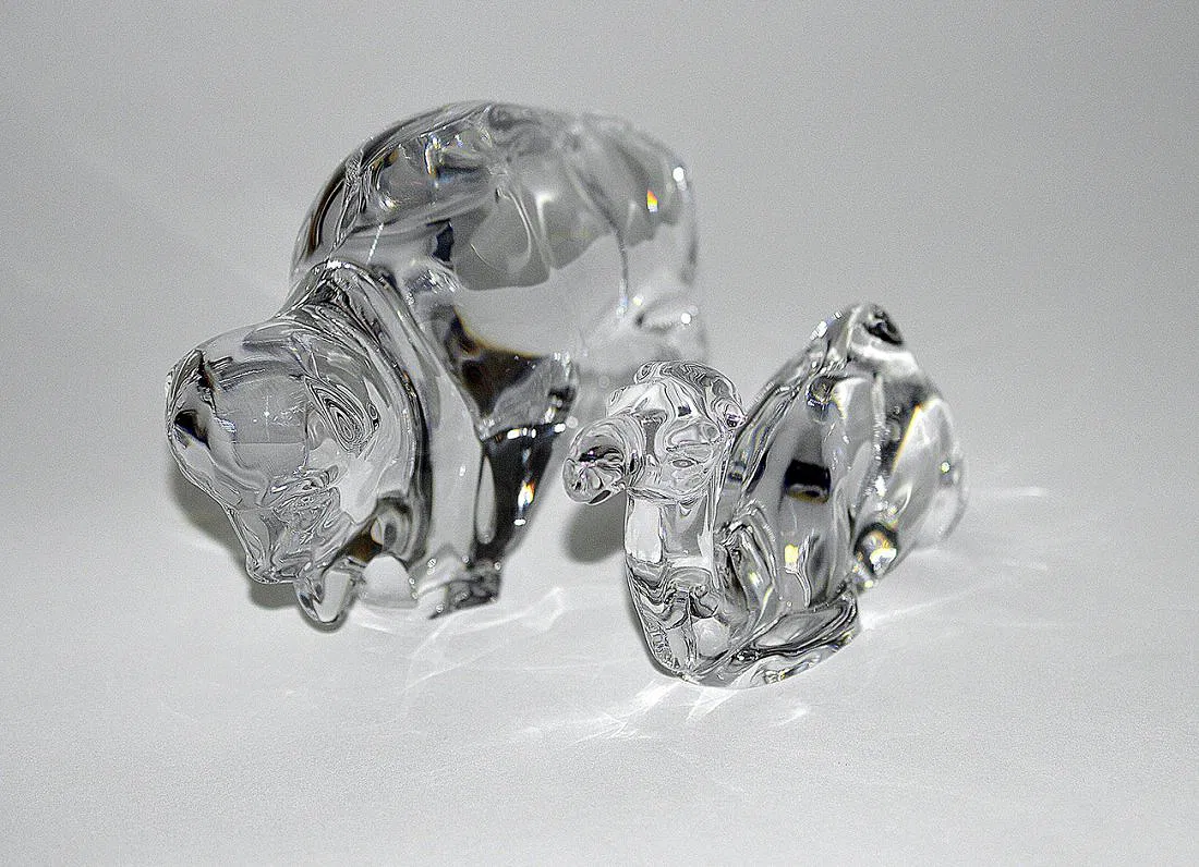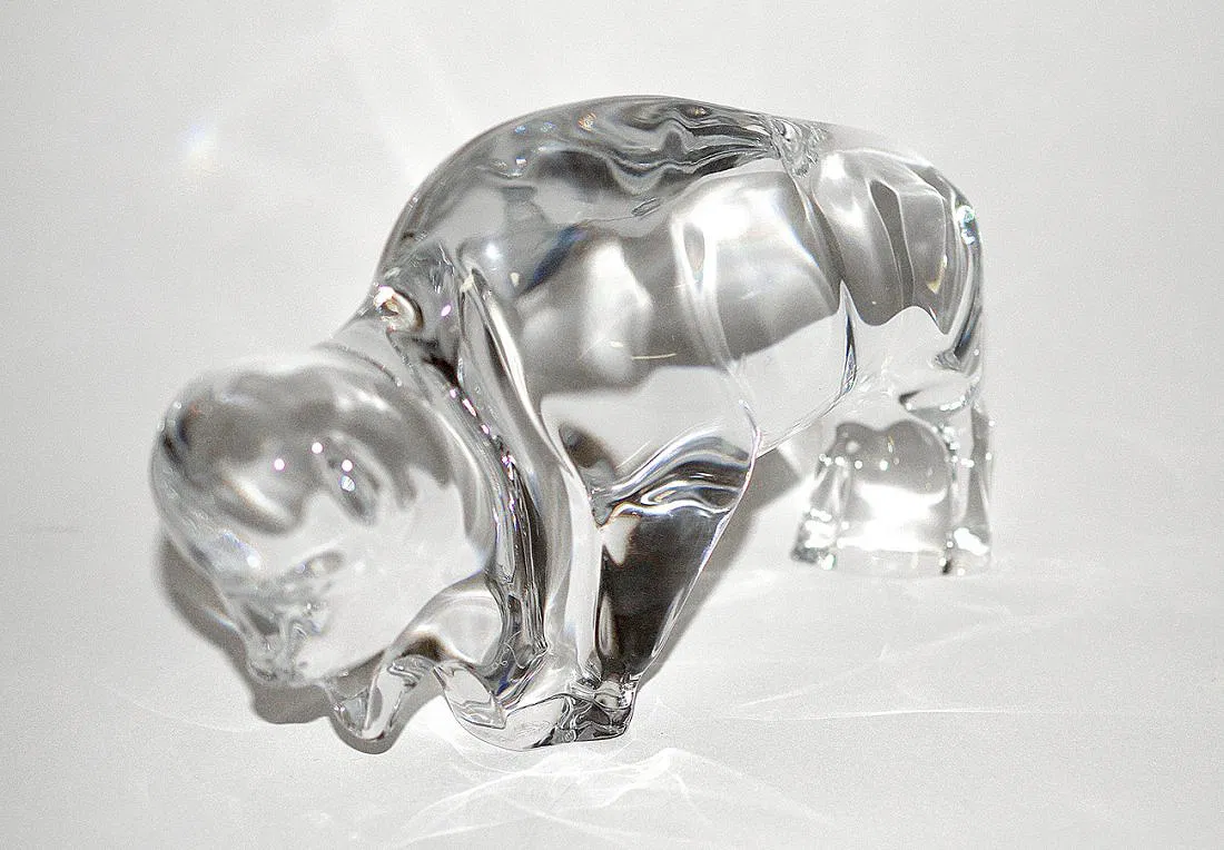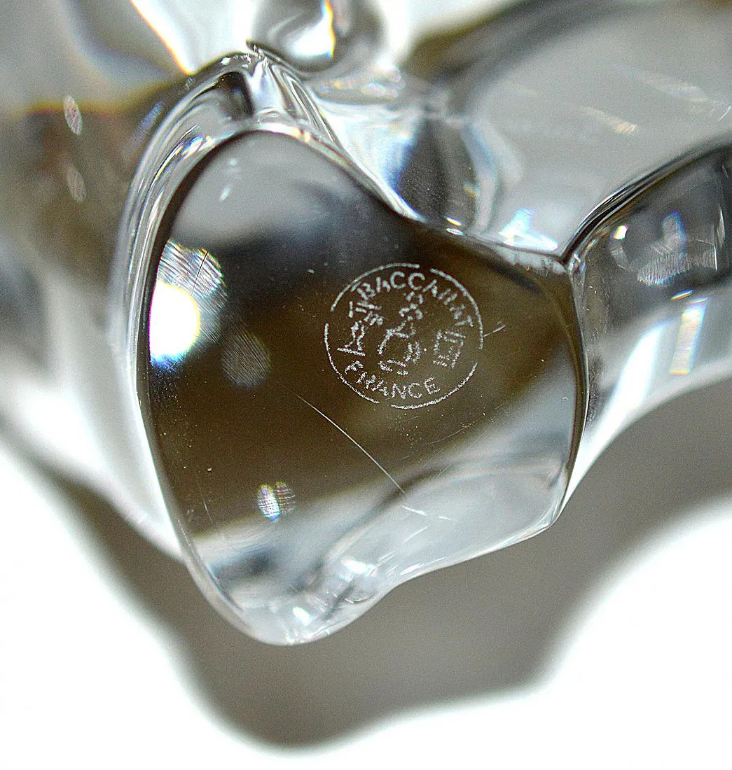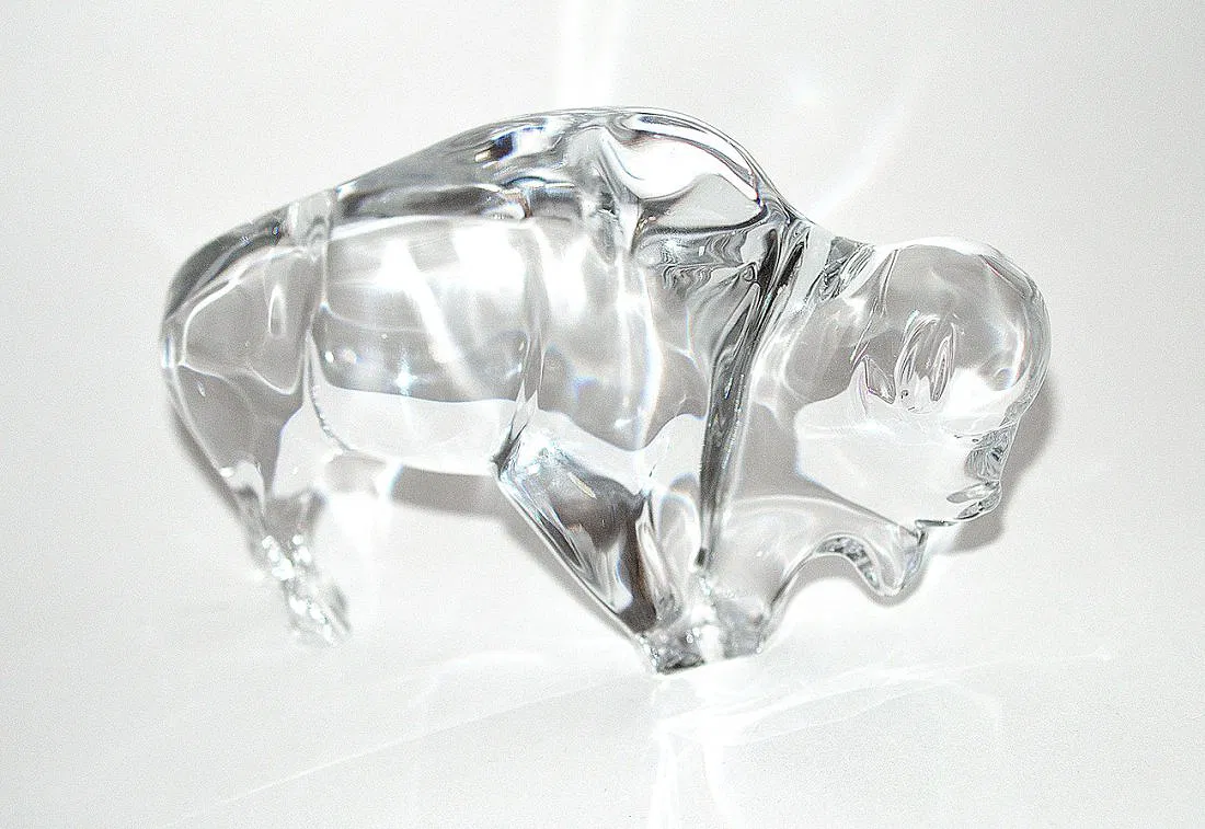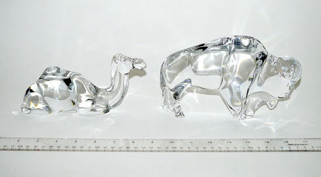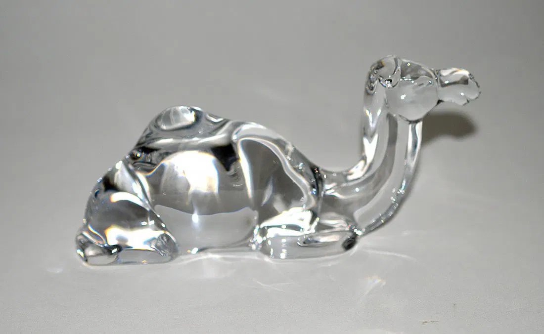 A buffalo [2 1/2″ W x 7 3/4″ x 5″ H] with a camel [1 3/4″ x 7″ x 3 1/2″ H]. Both stamped “Baccarat, France”. In good condition. From the Estate of Fred G. Peelen.